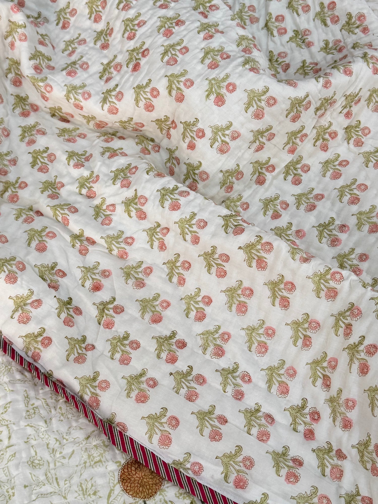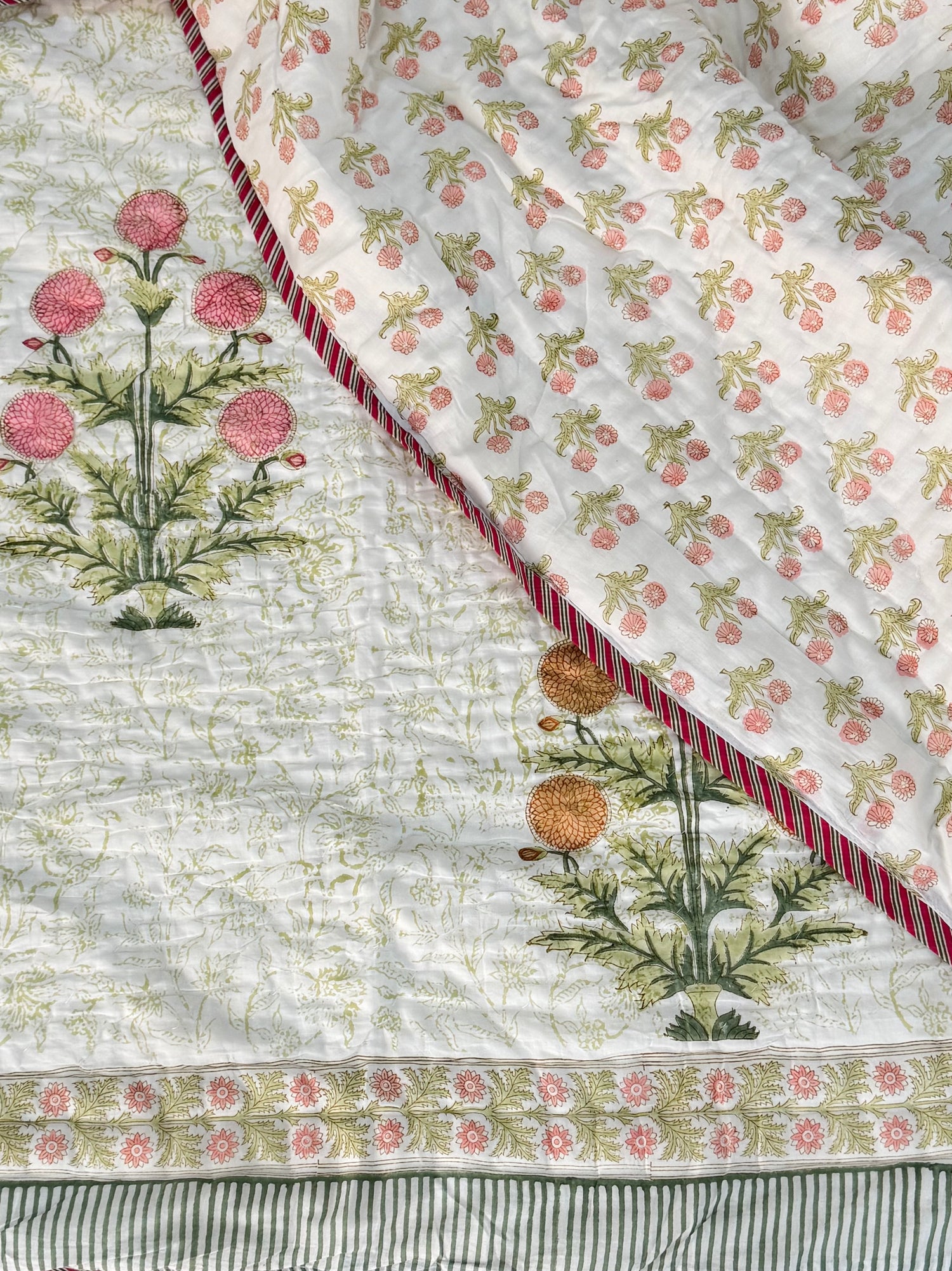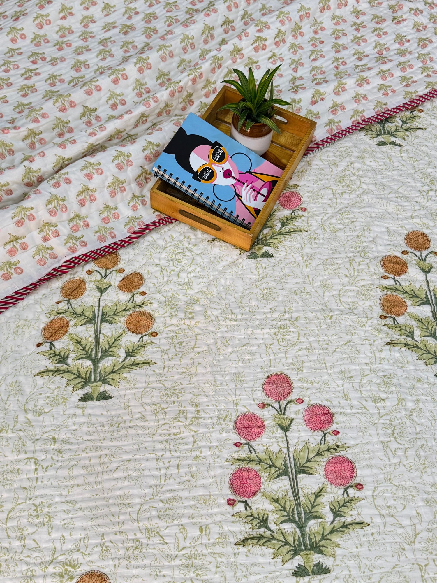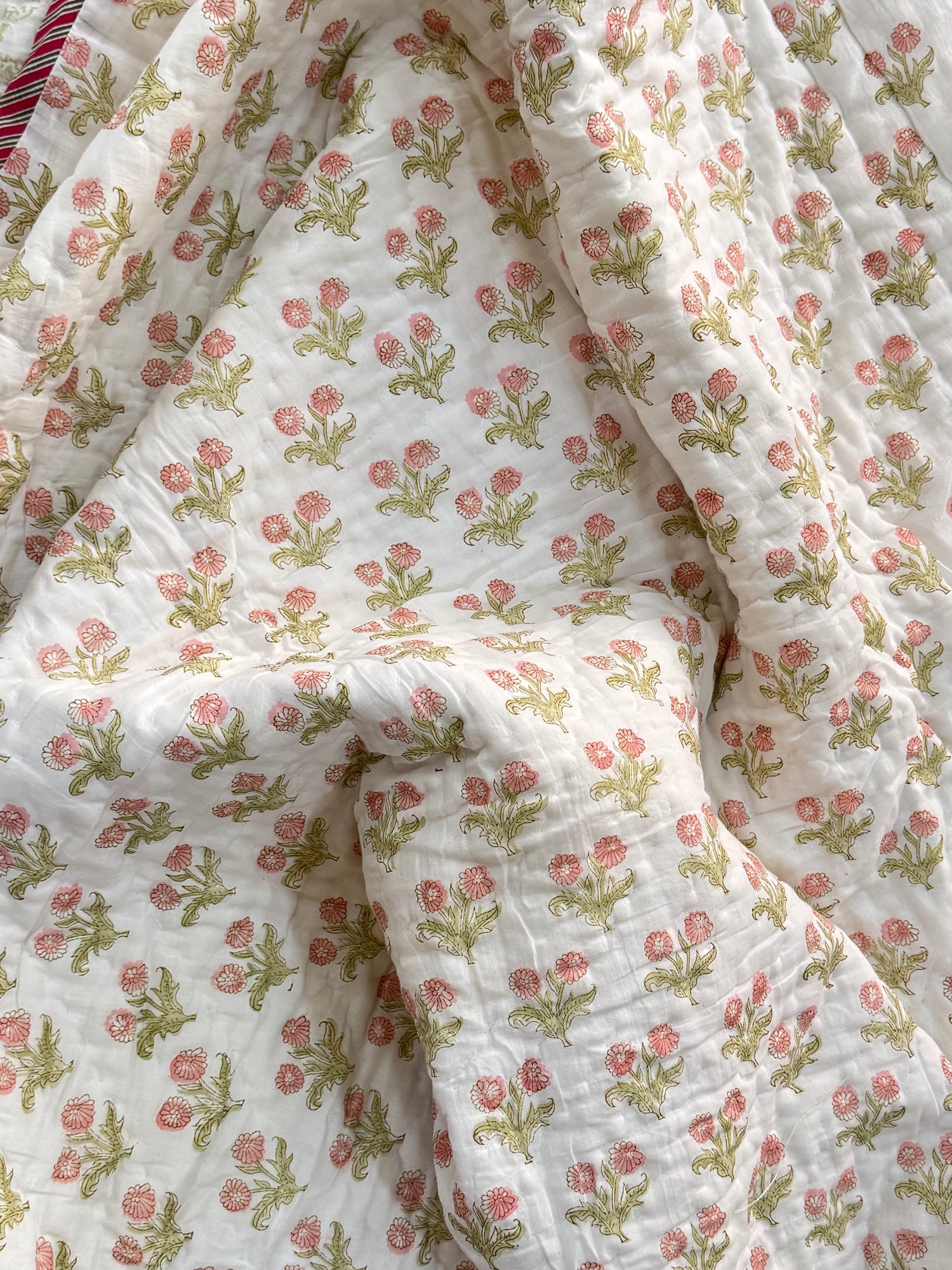 Floral HandBlock Printed Mulmul Reversible King Size Quilt - King Size Quilt (108*108 inches) is backordered and will ship as soon as it is back in stock.