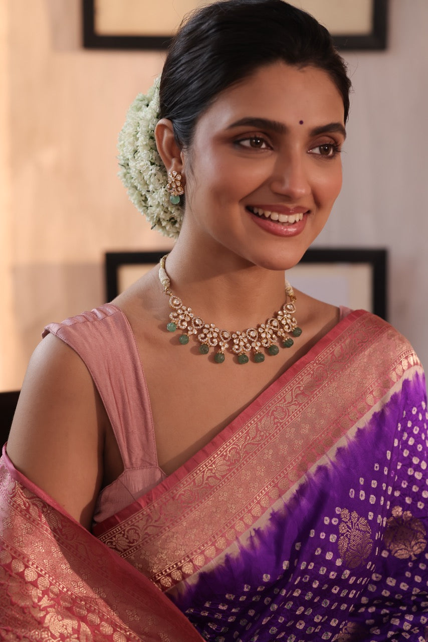 This exquisite 92.5 silver necklace is a stunning composition of Moissanite polki stones arranged in an intricate floral motif. Accented with lush green carved drops, it evokes elegance and vibrancy in every detail. Handcrafted to perfection, this piece bridges classic charm with contemporary flair. Ideal for festive occasions or intimate celebrations, it makes a graceful style statement.