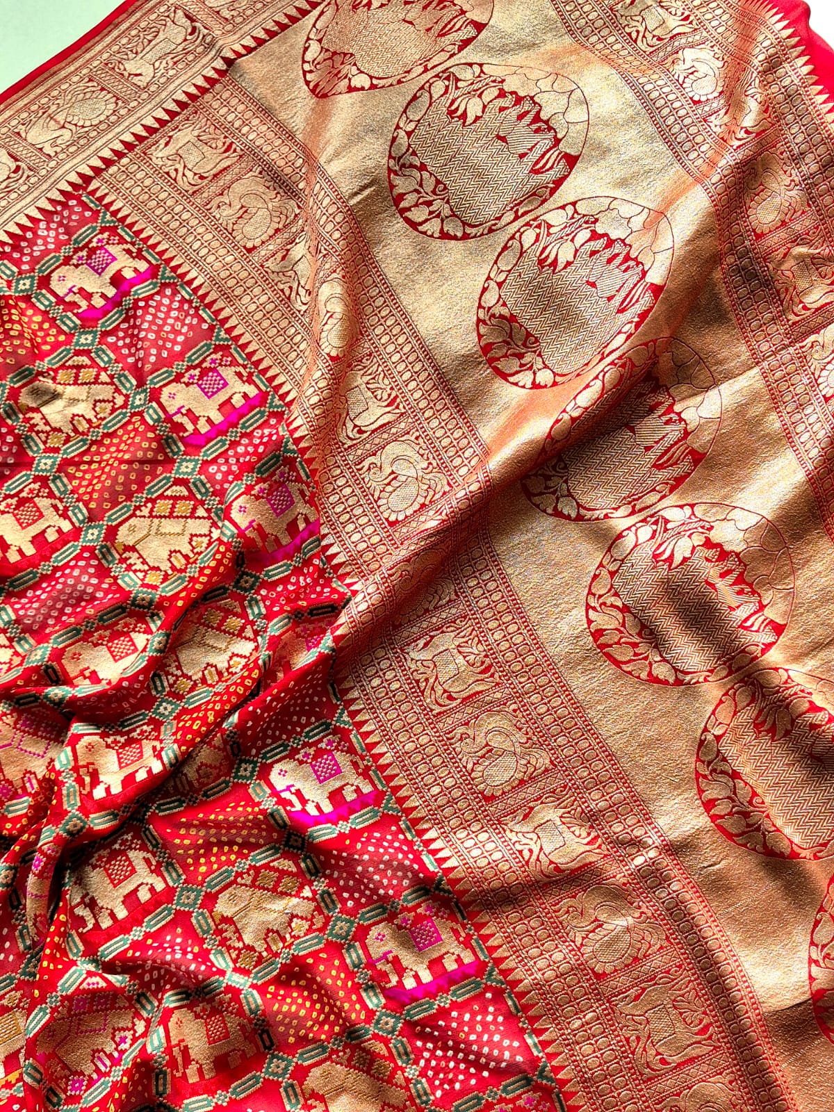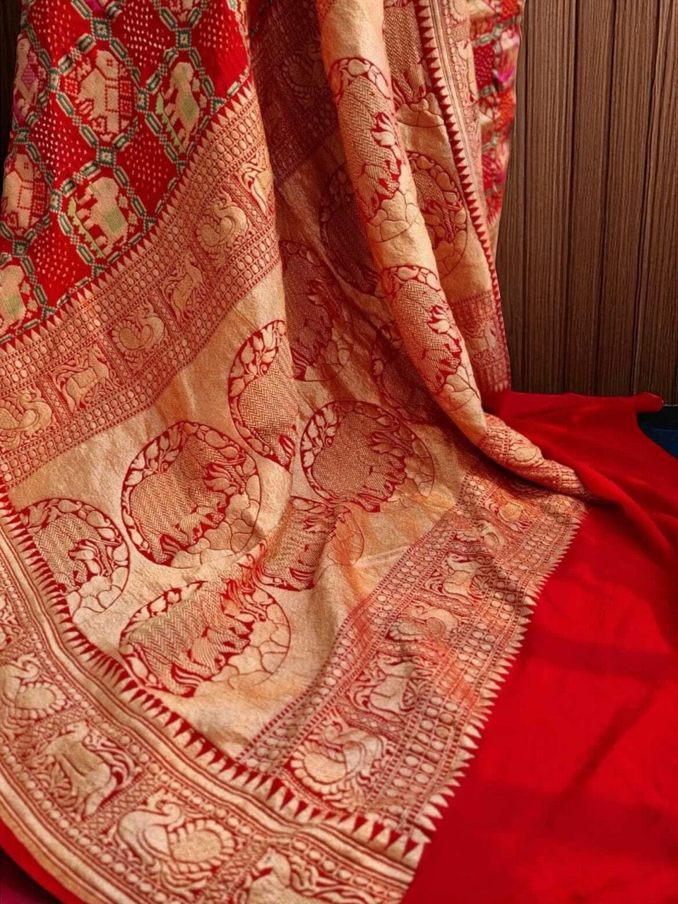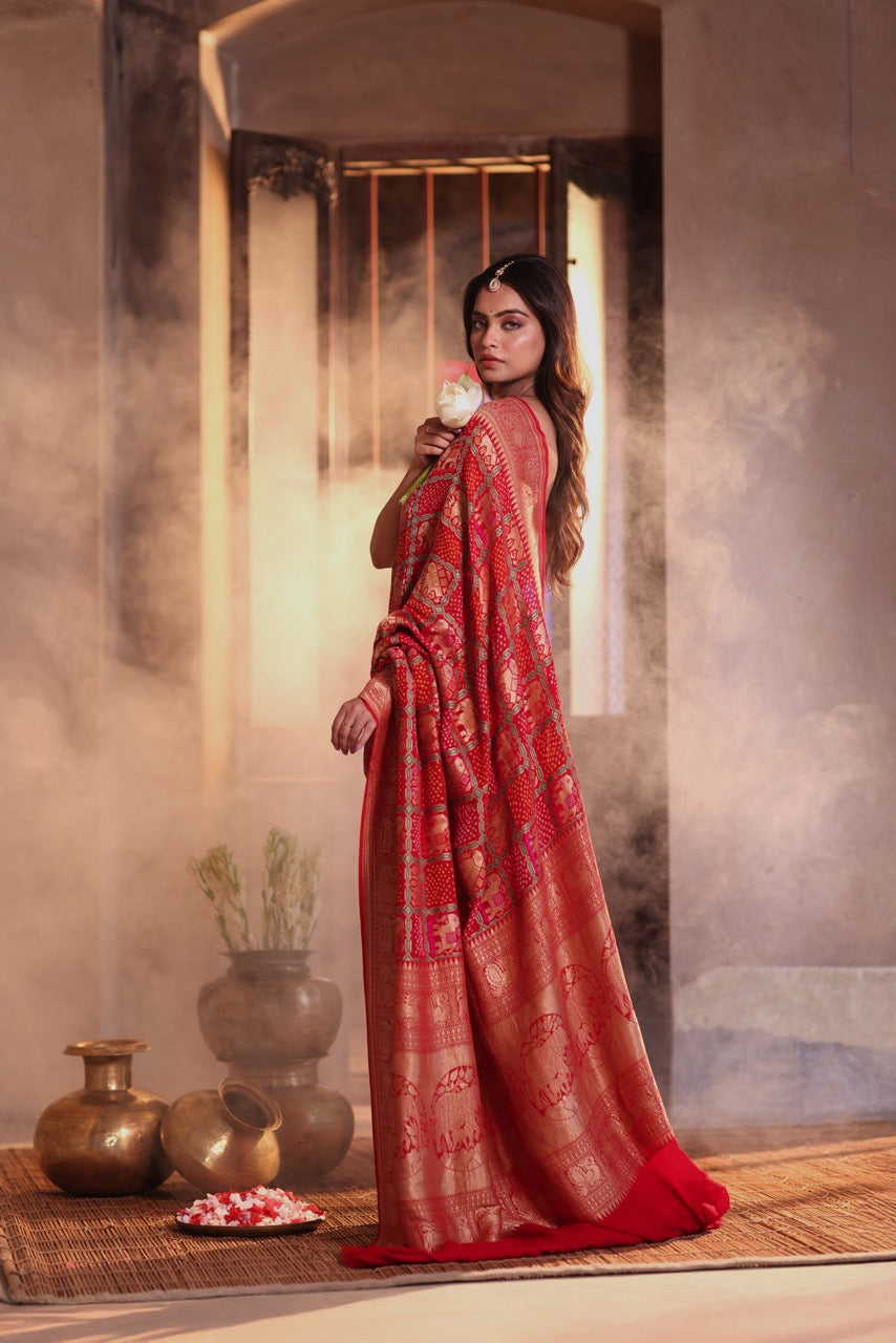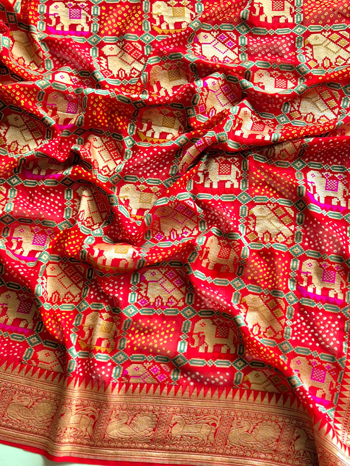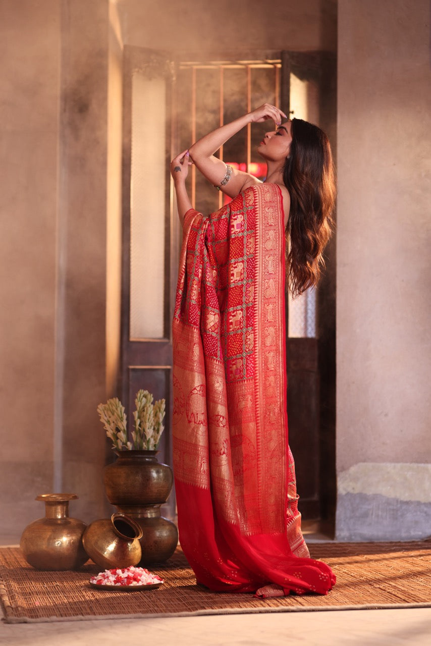 Gajraj Theme Red Banarasi Georgette Bandhani Saree