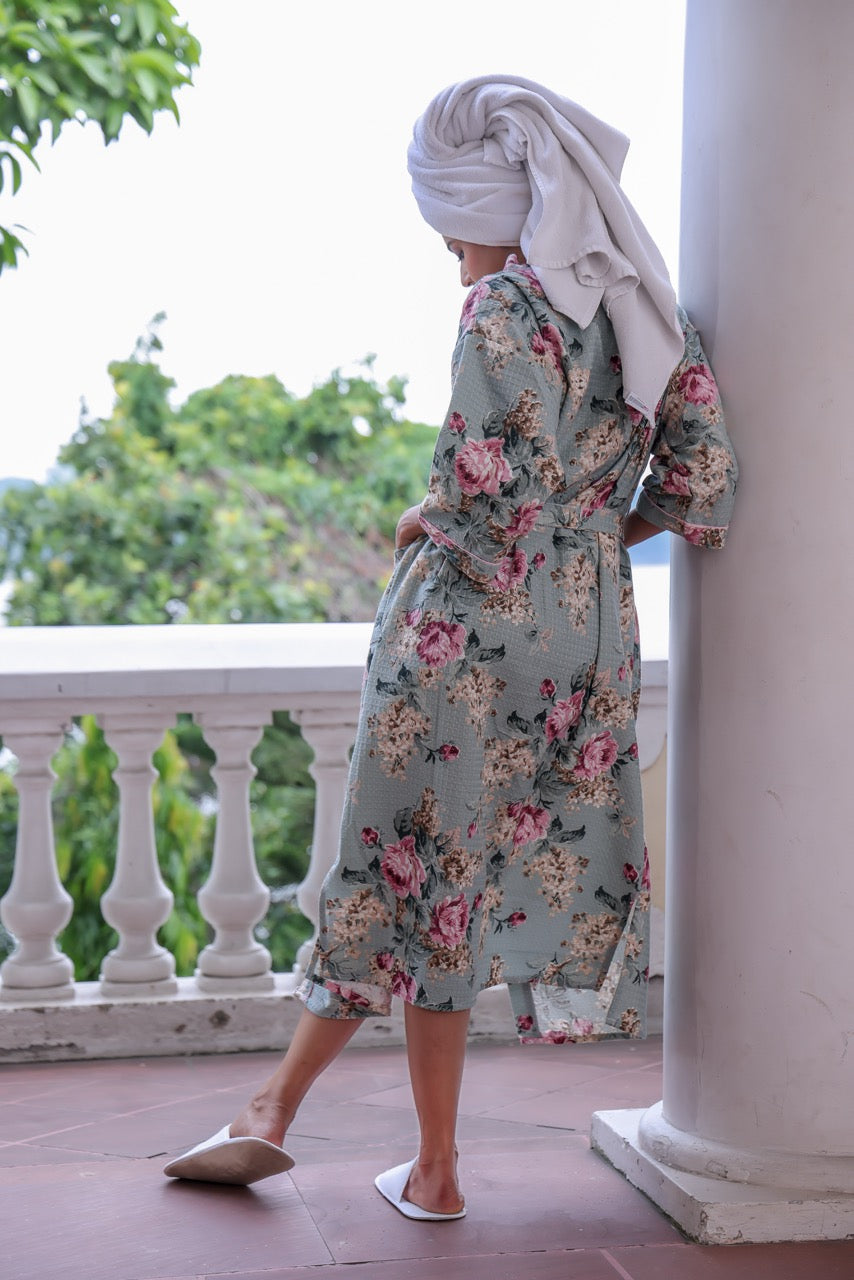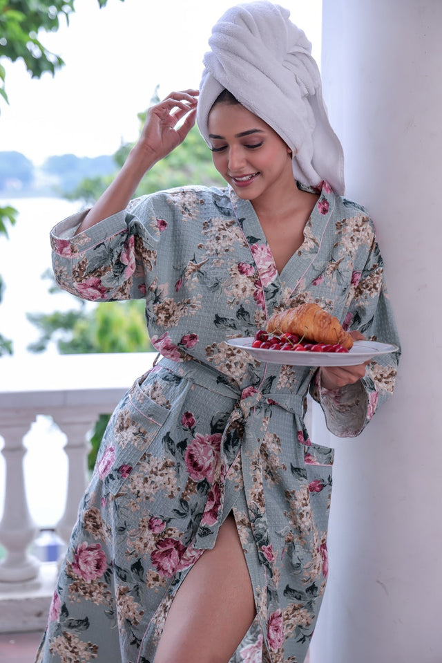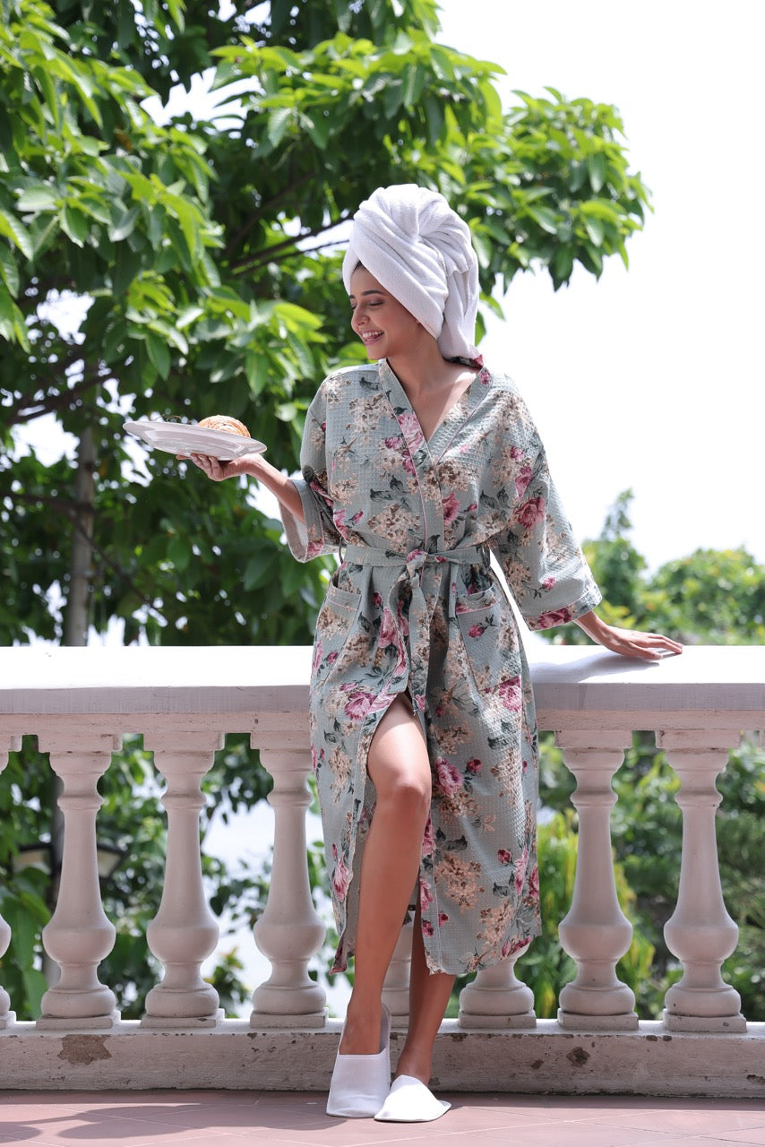 Breathe in the freshness of a blooming garden with the Garden Mornings Waffle Cotton Robe. Designed in a soft sage base with hand-drawn vintage floral motifs in blush and rose, this robe wraps you in the cozy charm of countryside calm. Featuring a textured waffle weave, roomy pockets, and a belted silhouette, it’s perfect for slow breakfasts and balcony daydreams.