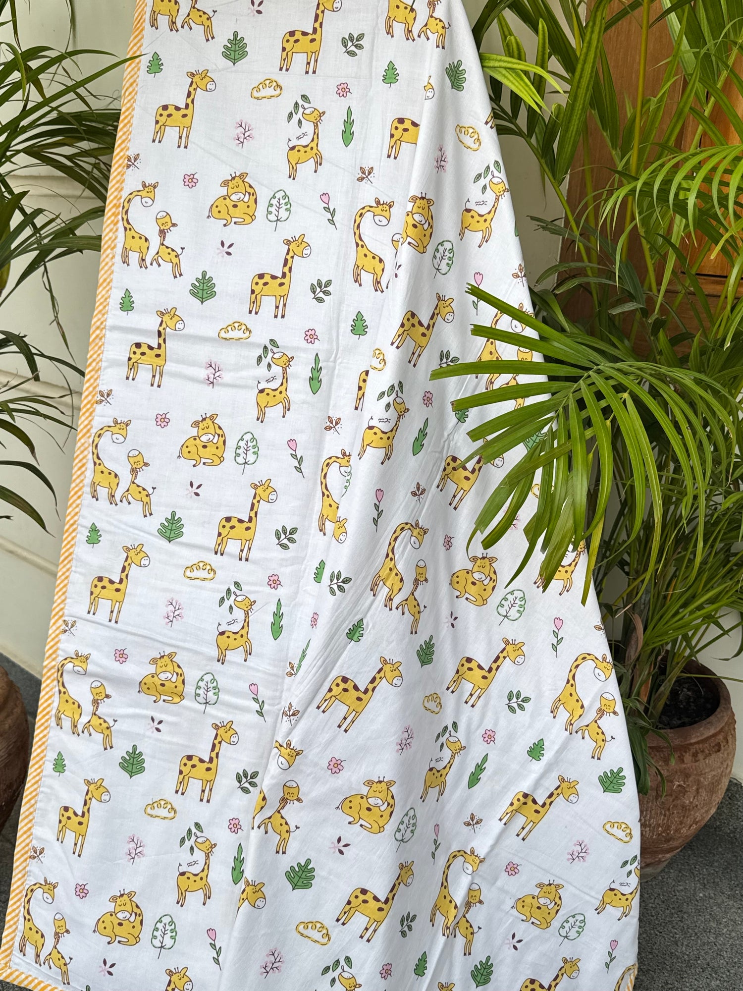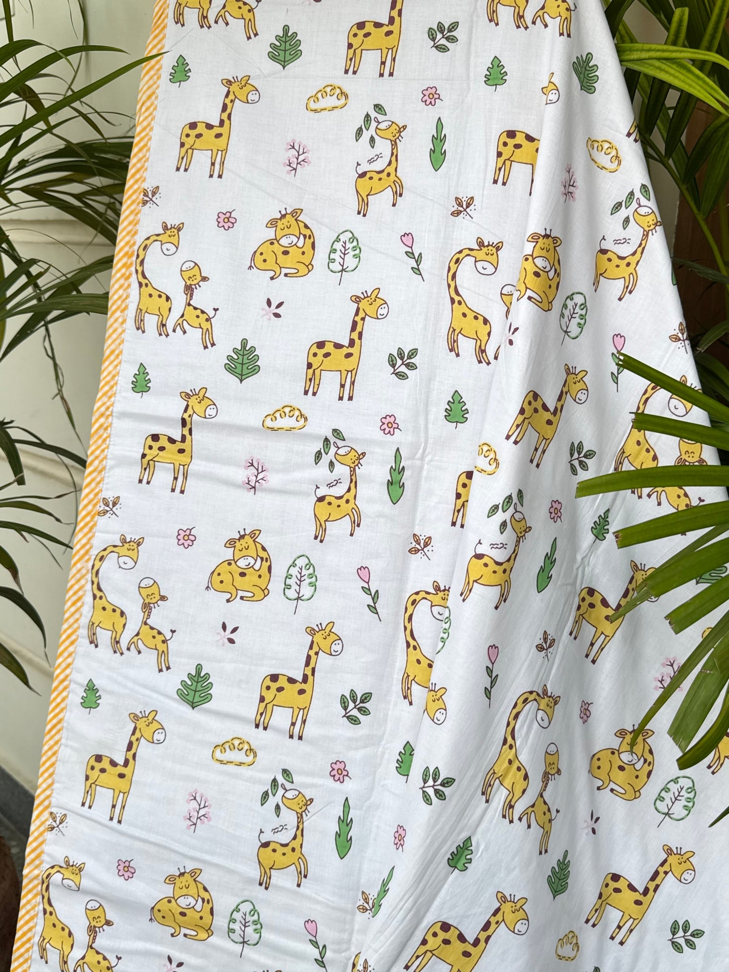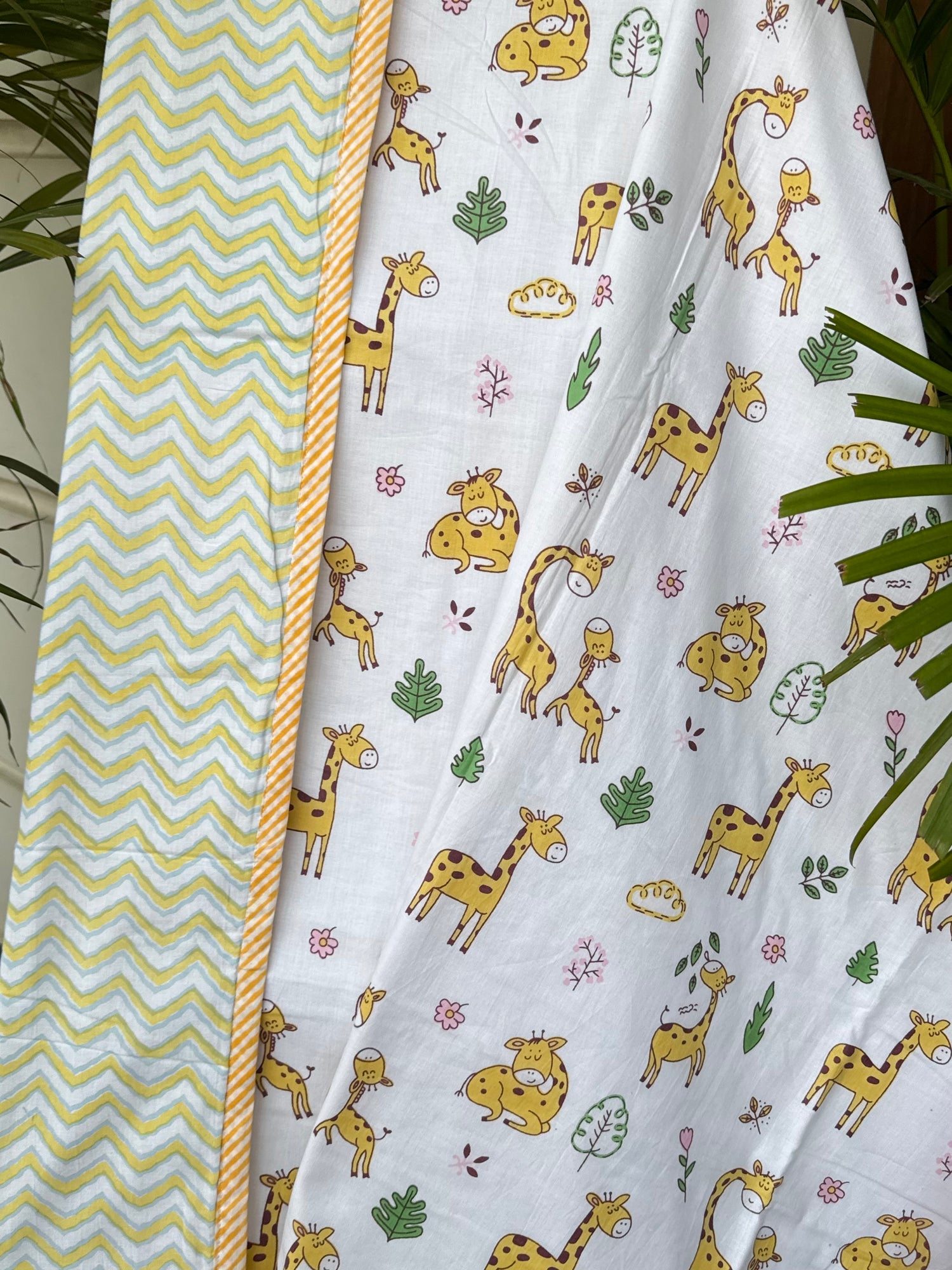 Wrap your little one in comfort with our adorable giraffe-themed layered blanket, beautifully made by artisans in Jaipur. Made from breathable mulmul cotton and lined with a soft, lightweight flannel, this eco-friendly and reversible kids blanket is perfect for warm climates and year-round use.