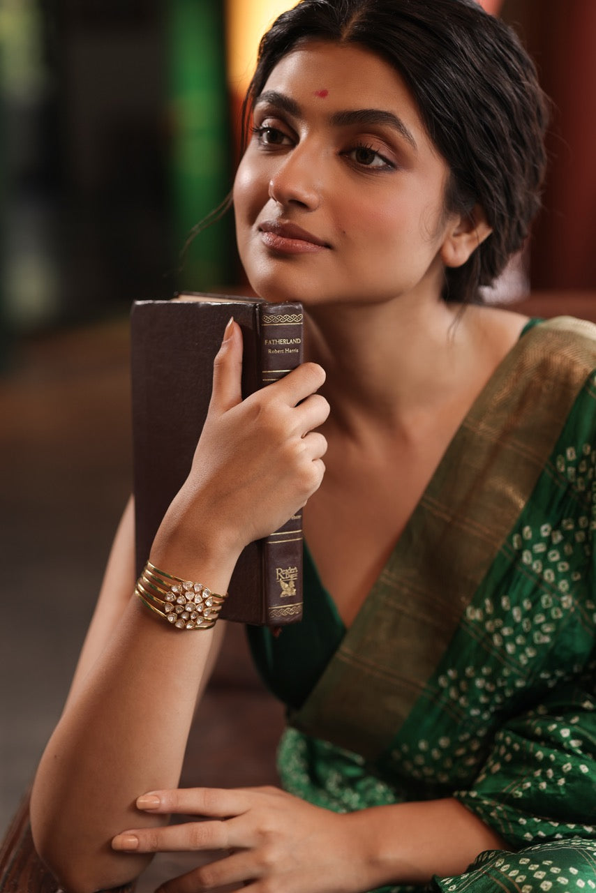 This 92.5 silver handcrafted adjustable handcuff is finished in a rich golden polish and designed with five parallel open bands that converge into a striking floral cluster of uncut Moissanite polkis. The openwork structure provides a lightweight yet bold aesthetic, blending contemporary minimalism with regal Indian charm. Golden Radiance is perfect for both festive occasions and elegant daywear.