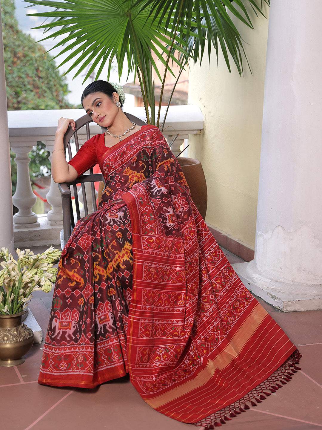 Graceful Handloom Brown and Red Mulberry Silk Ikat Patola Saree with Tiger and Elephant Motifs