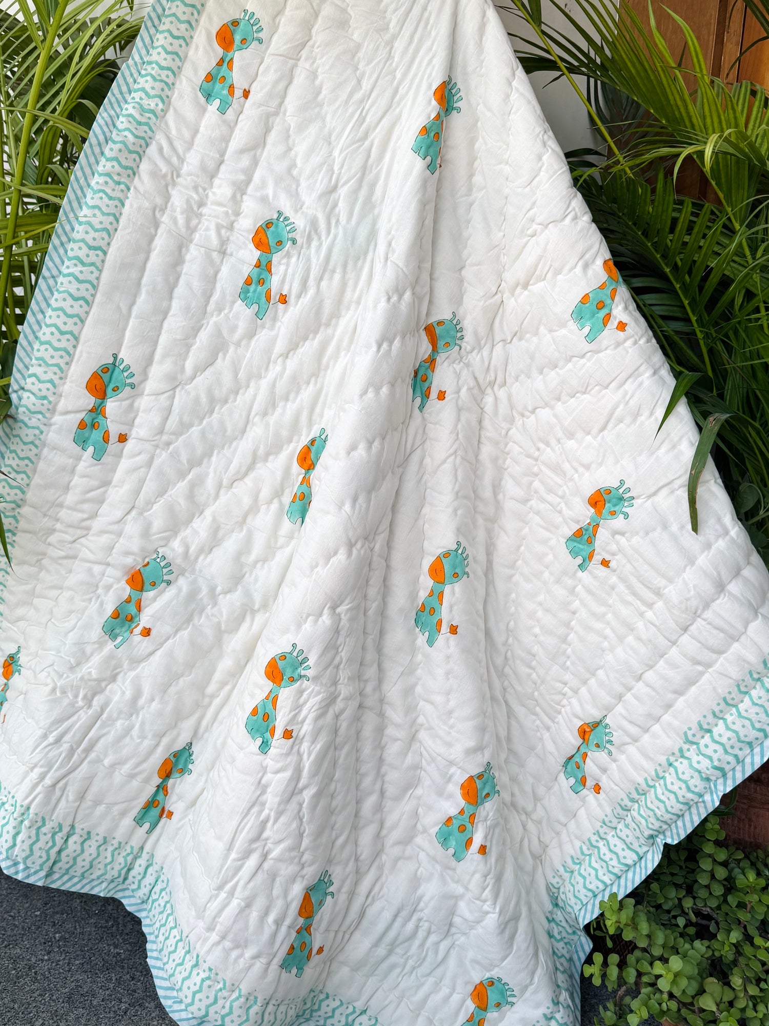 Green Giraffe Elephant Blockprint Kids Quilt - Kids Size (60*40 inches) 0-6 yrs is backordered and will ship as soon as it is back in stock.