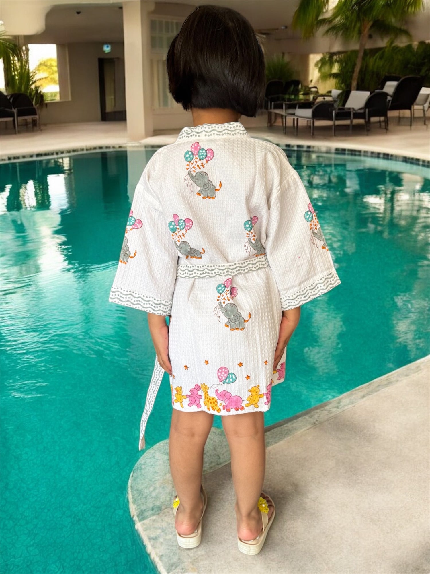 Wrap your little one in softness and charm with our Cute Elephant Theme Cotton Waffle Bathrobe, handblock printed by expert artisans from Jaipur. made of pure cotton waffle weave, it is lightweight, super absorbent, and gentle on delicate skin — making it ideal for daily use after showers, swimming classes, beach vacations, summer camps, and lounging comfortably at home.