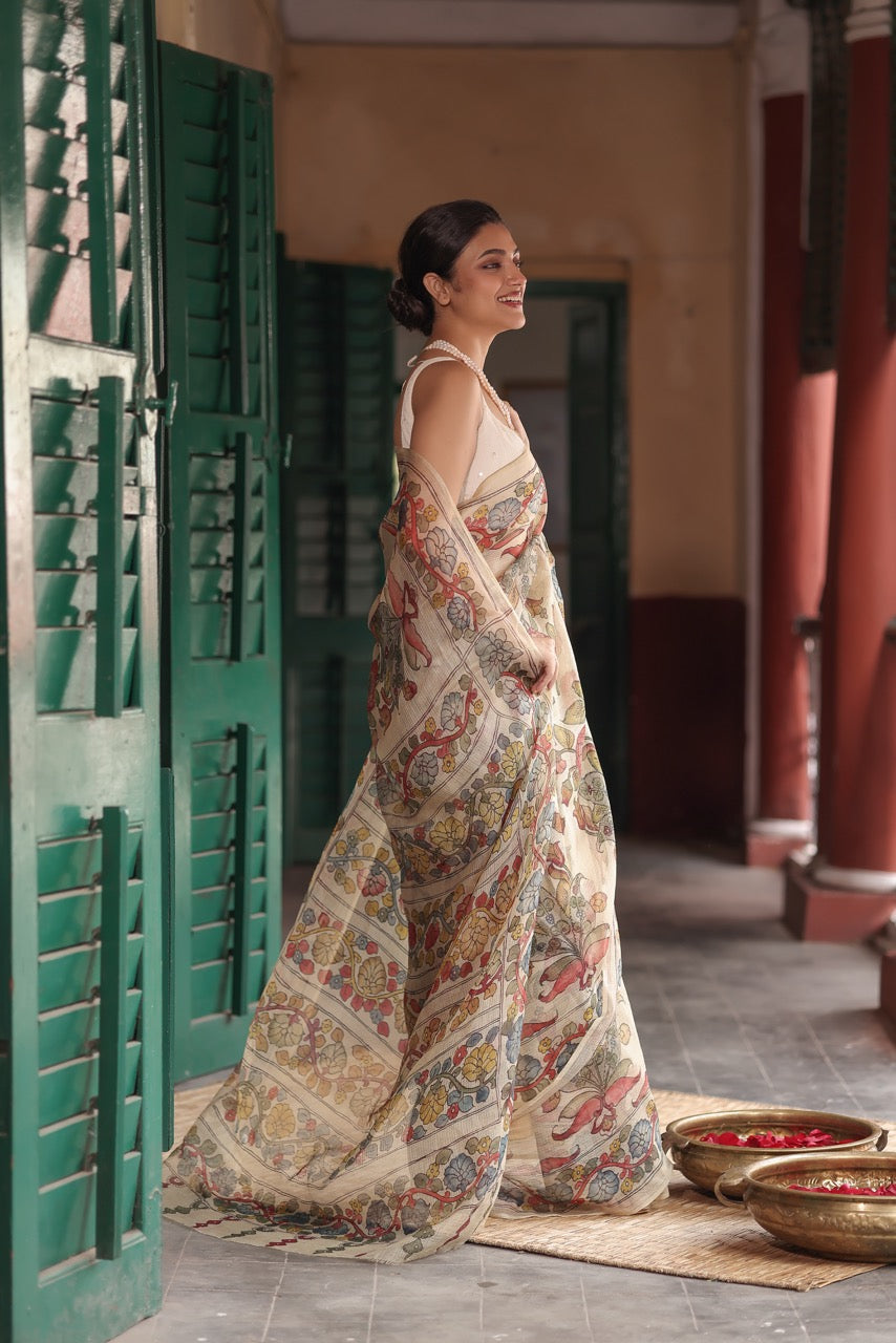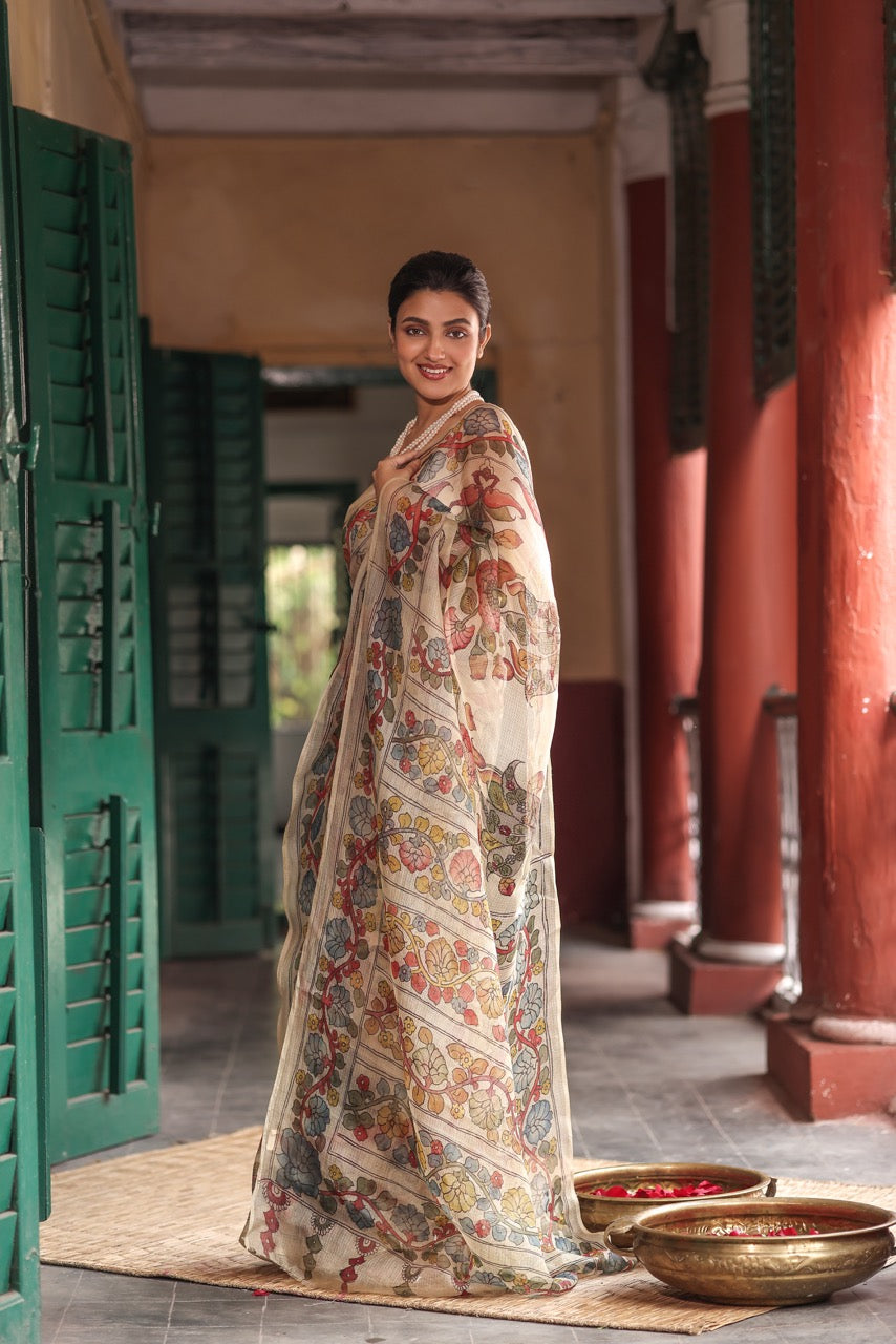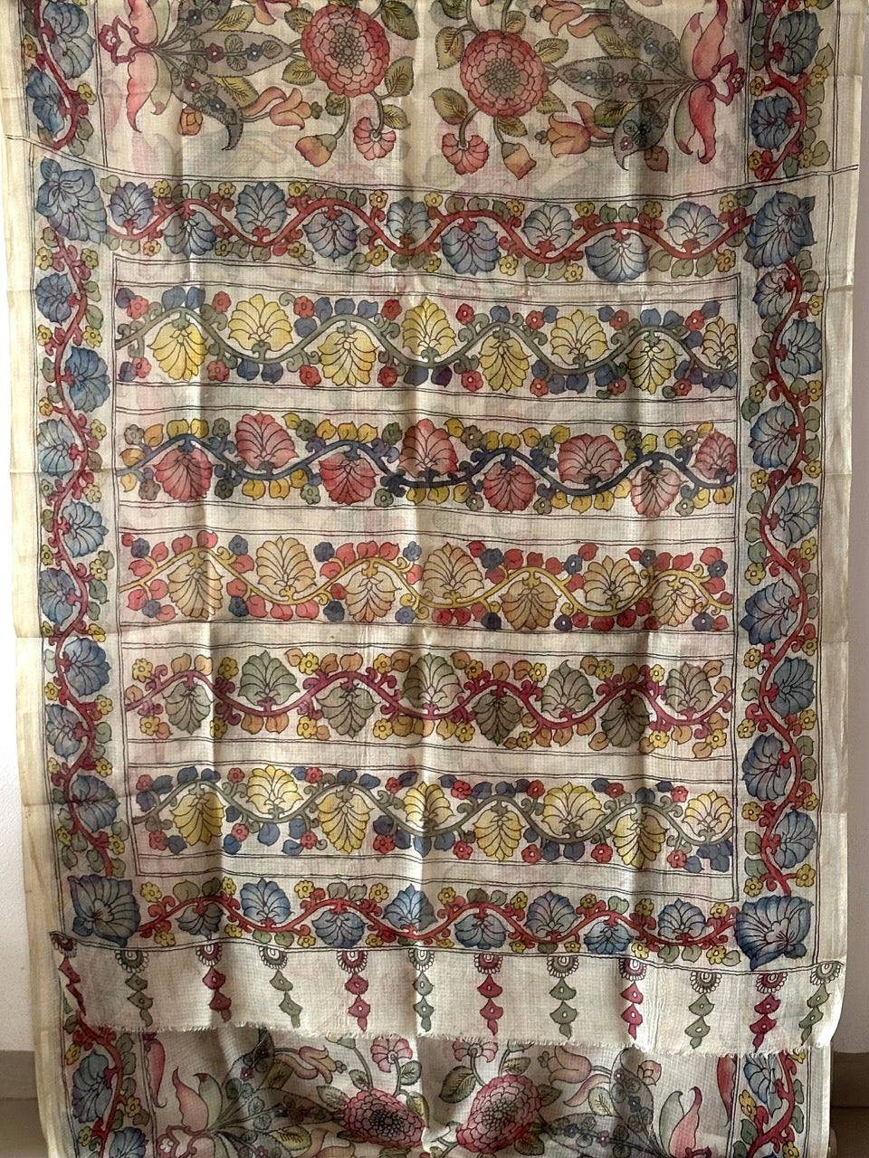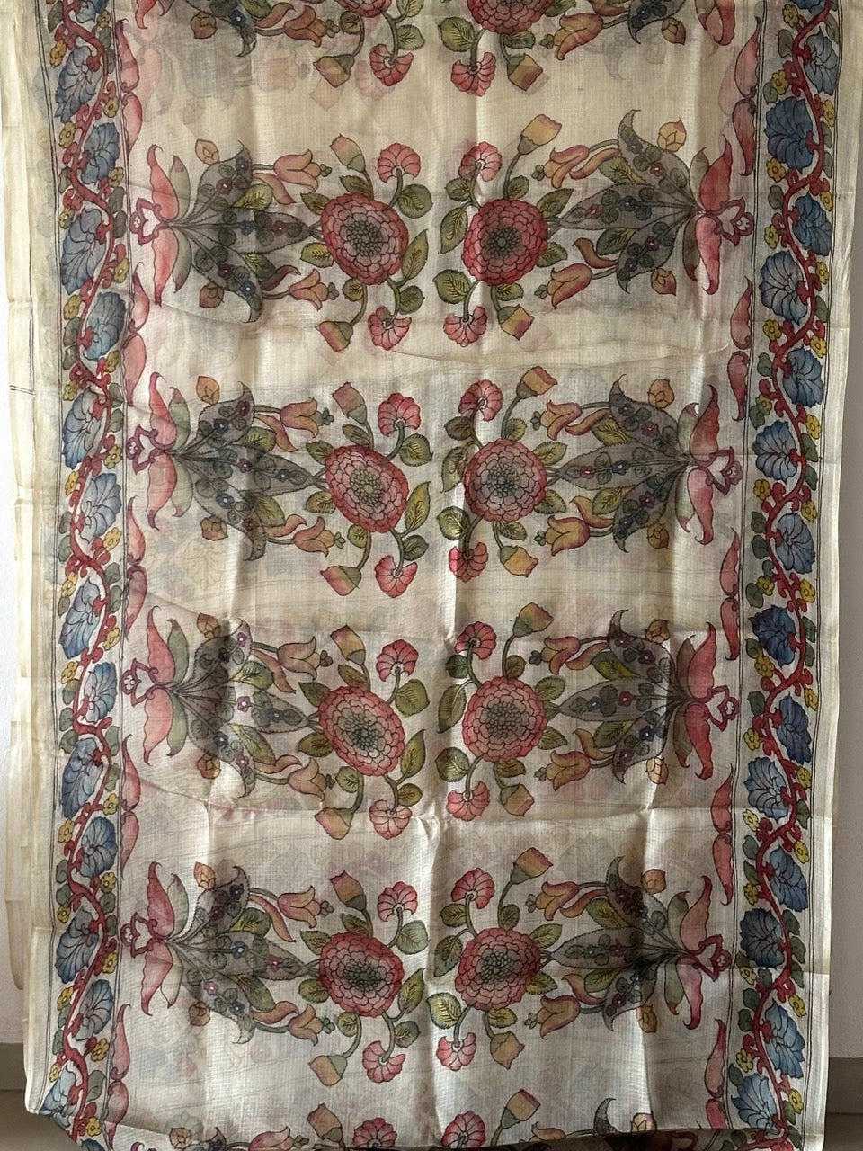 This ethereal saree is crafted from the finest Kota silk, known for its lightness and sheer elegance. Hand-painted in the timeless Kalamkari tradition, it features rows of blooming florals in earthy reds, olives, and ochres. The intricate floral jaal is bordered by a delicately detailed floral vine, reflecting the finesse of heritage craftsmanship. A graceful drape that blends airy comfort with artistic storytelling.