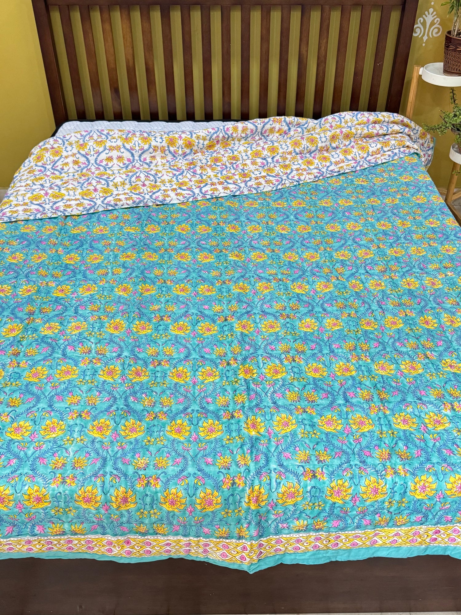 Each quilt is carefully layered and finished by skilled artisans, reflecting thoughtful craftsmanship and time-honoured techniques. Ideal for year-round use, it brings calm, colour, and handcrafted charm to your bedroom, rooted in heritage and made for mindful living homes.