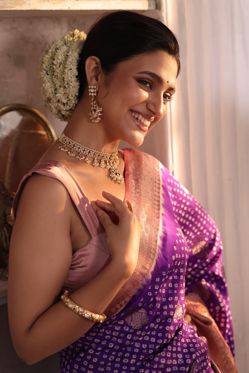 Radiating timeless grace, the Gulbano Kundan Choker Set is crafted in 92.5 silver with intricate Zircons and delicate pearl accents. The floral motifs and dangling pearl clusters exude Mughal-inspired charm, perfect for festive and bridal occasions. Paired with a statement jhumka-style earring, this set strikes the perfect harmony between traditional elegance and regal allure. A luminous tribute to heritage and craftsmanship.