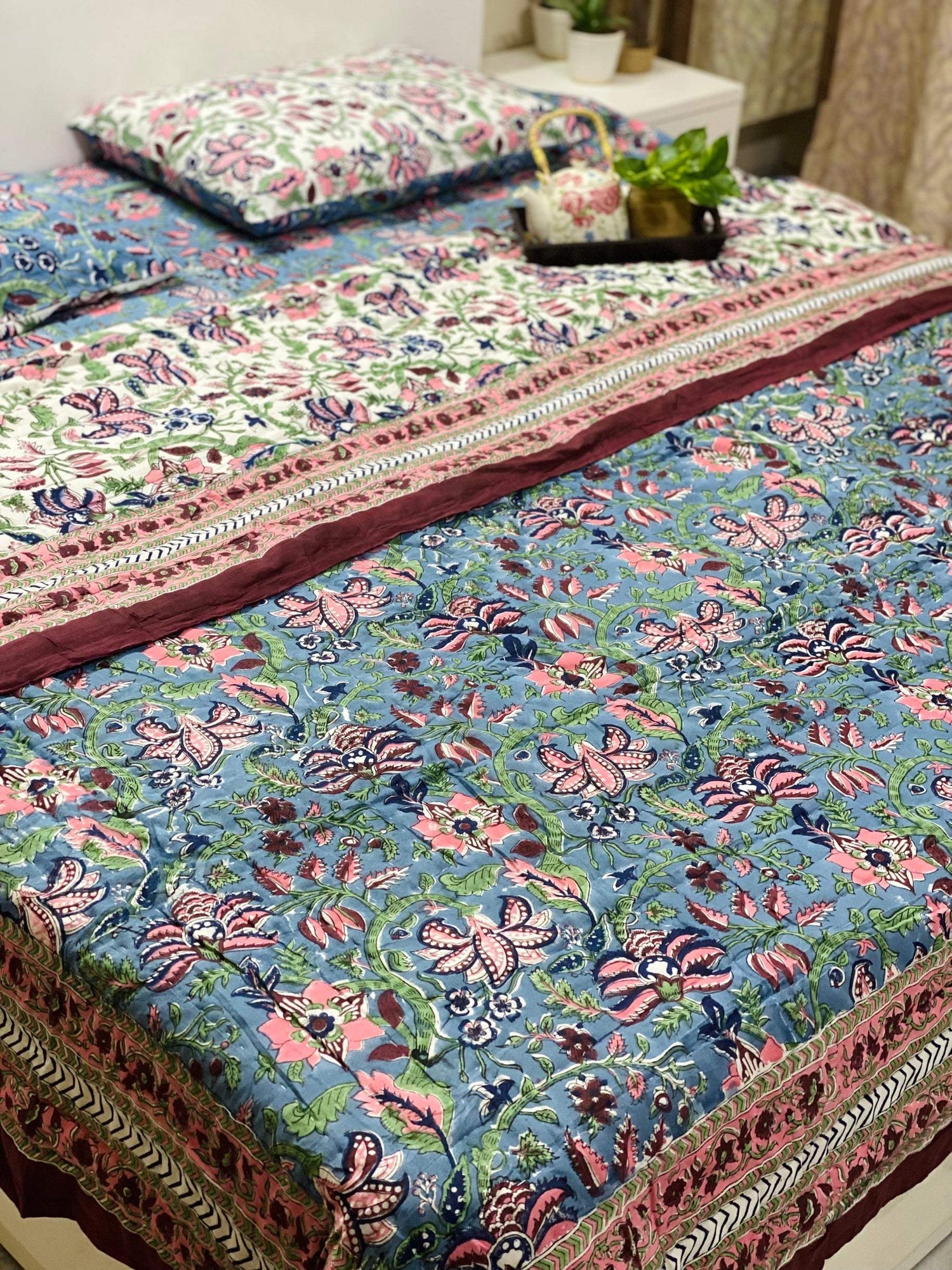 Sanganeri Hand Block Printed Cotton Reversible quilt/comforter. The quilt is made by the artisans of Rajasthan using azo-free dyes.