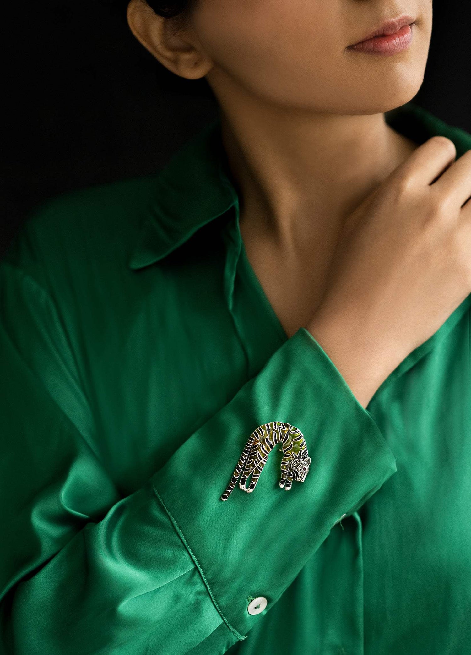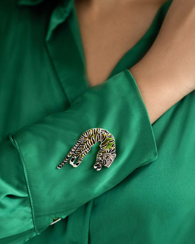 This type of brooch adds a striking, artistic element to the outfit and combines both elegance and a hint of fierceness with the animal motif. It’s crafted with enamel detailing and intricate metalwork to create contrast in the stripes, making it visually captivating.