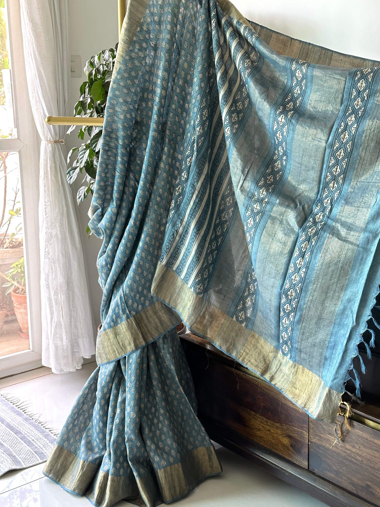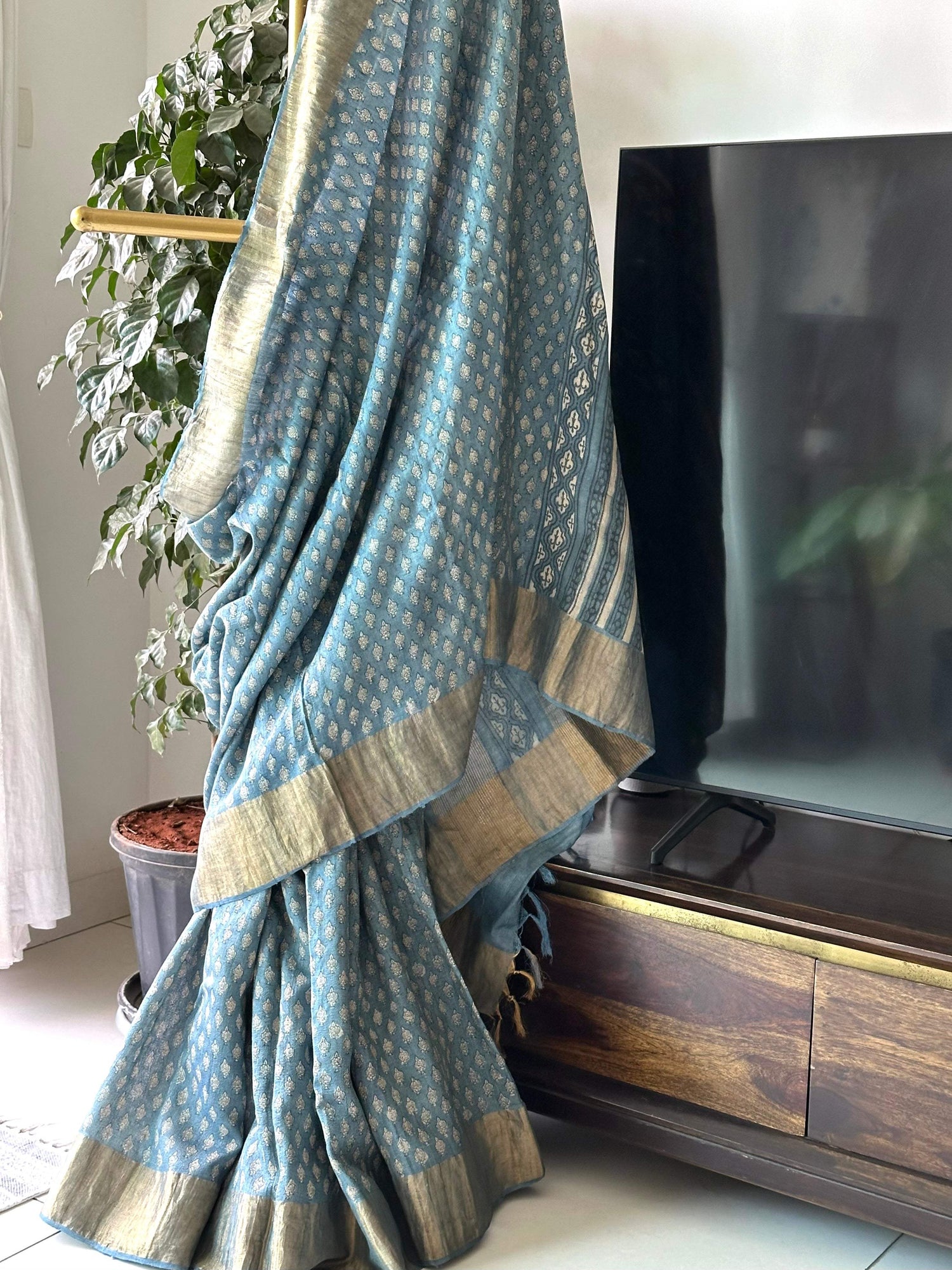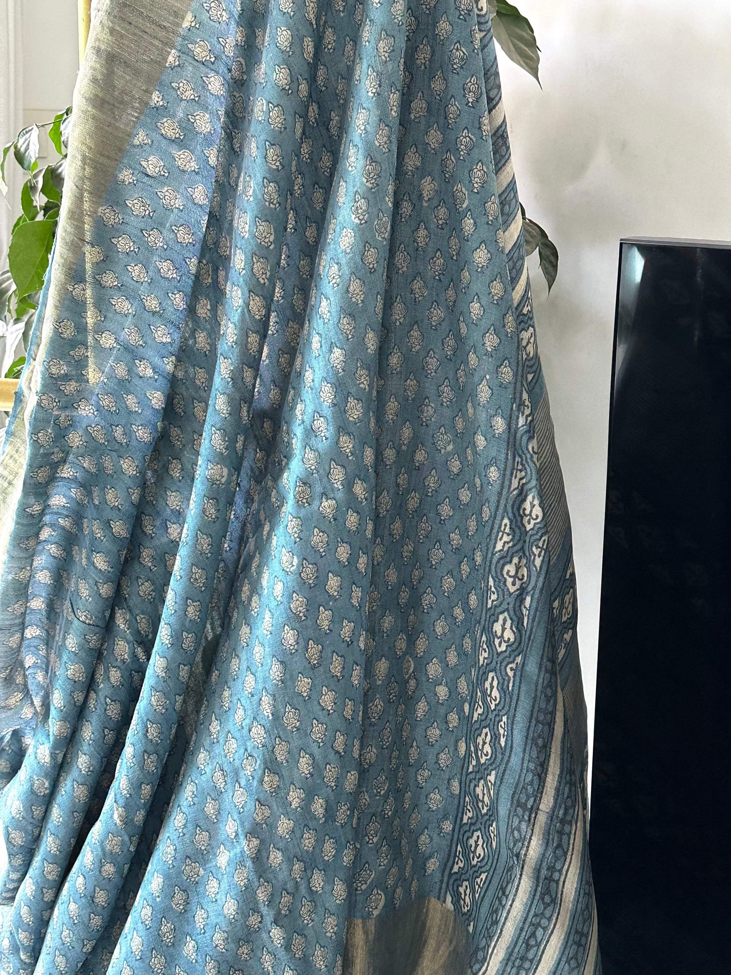 A handloom beauty of subtle handblock printed motifs on tussar silk saree. Sarees comes with unstitched blouse piece.
