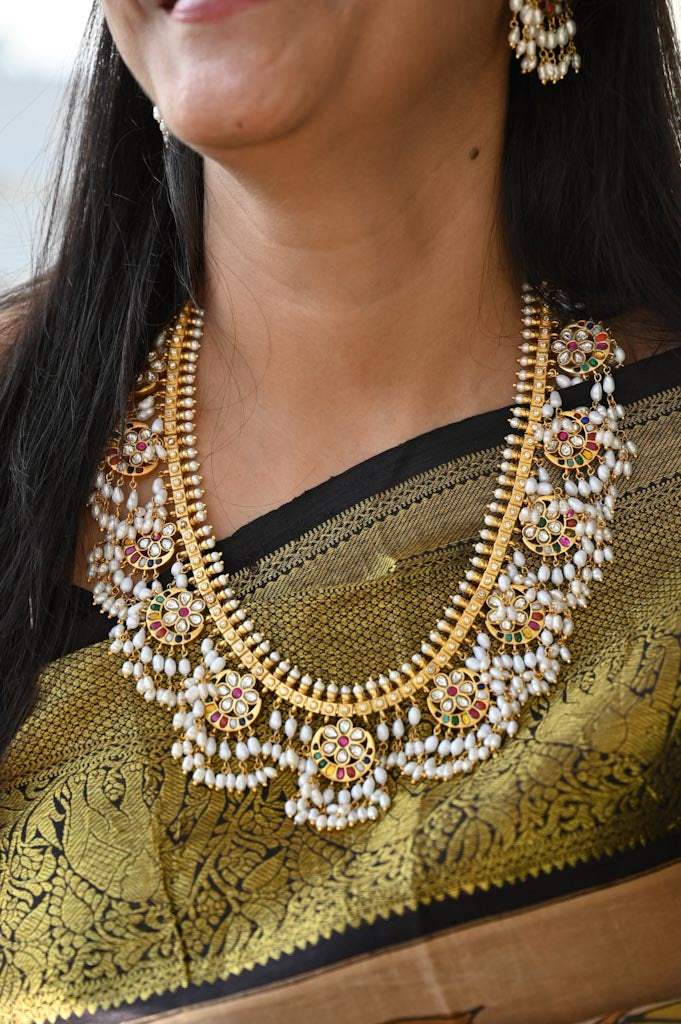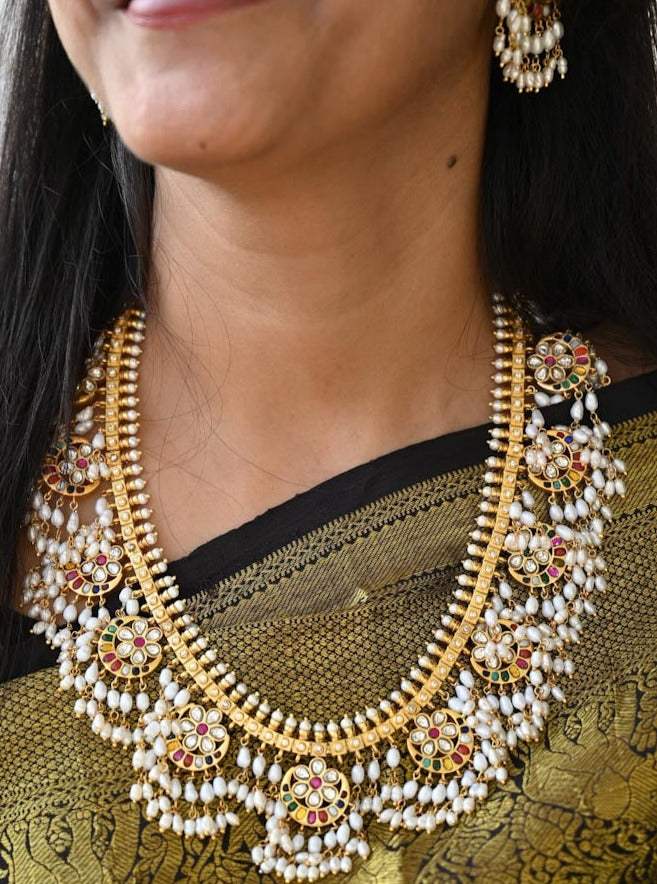 Heirloom Elegance - This exquisite jewelry set features a traditional South Indian Gutta Pusalu design, crafted in 92.5 silver with a gold-toned finish. The necklace and matching chandelier earrings are adorned with small colored stones. The defining characteristic is the elegant clusters of small white pearls cascading from both pieces. These pearl "drops" are a hallmark of the Gutta Pusalu style. Together, the intricate detailing and pearl clusters create a cohesive and stunning set.