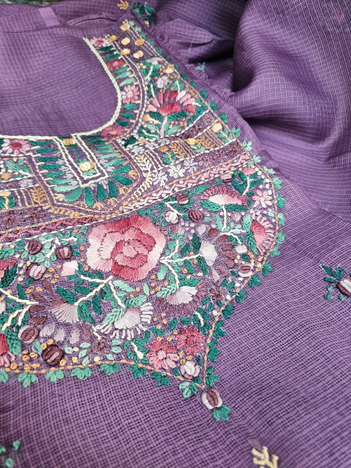 Three-piece unstitched Phulkari hand embroidered suit set. Back of the suit is plain. The stitched look shown in the image is only for representation purposes and may not match the product 100%. Please note this is an Unstitched suit set.