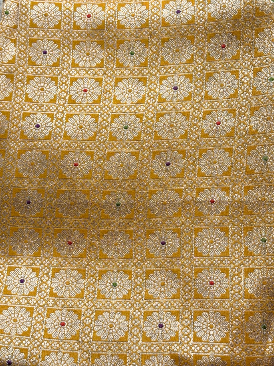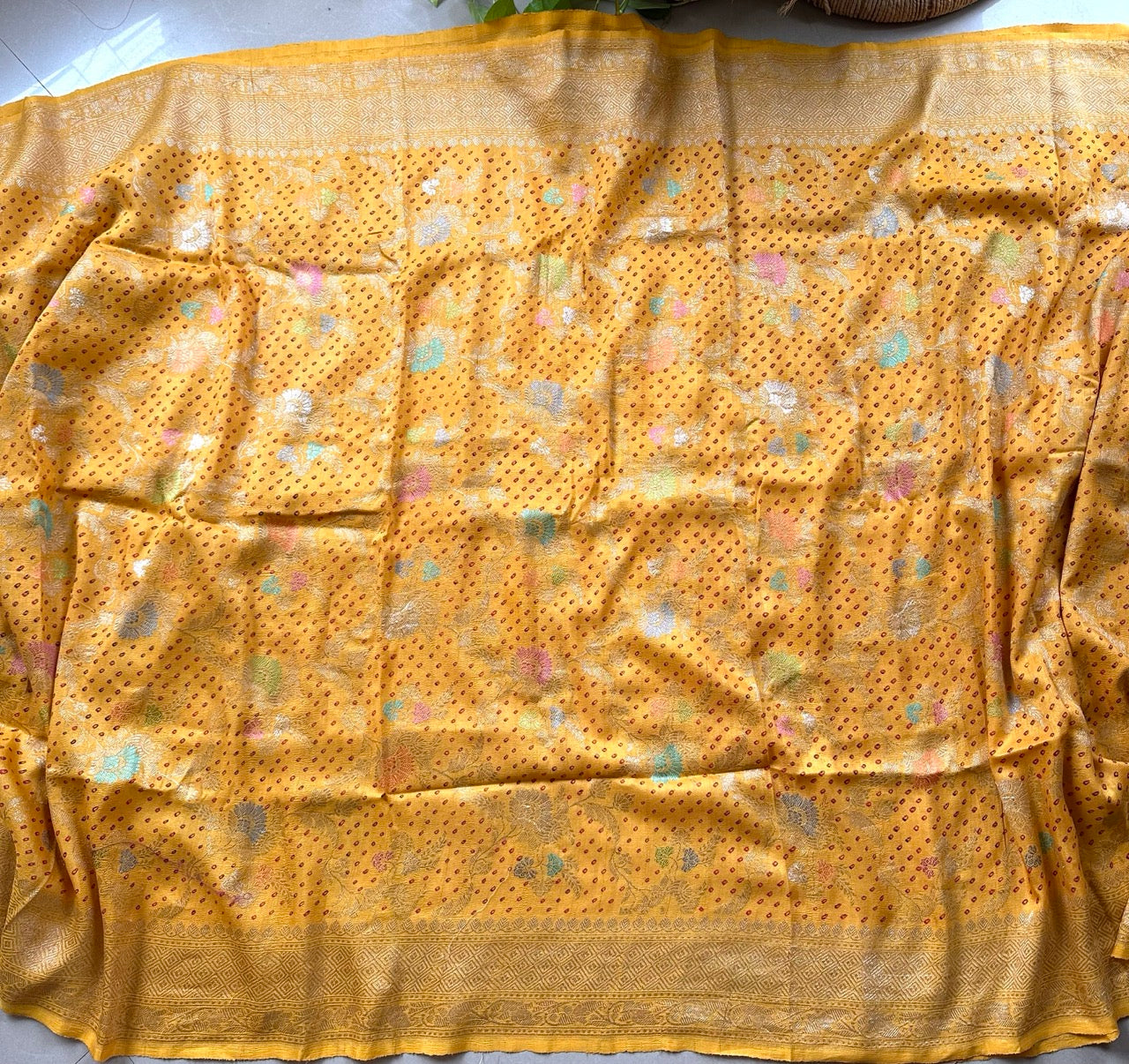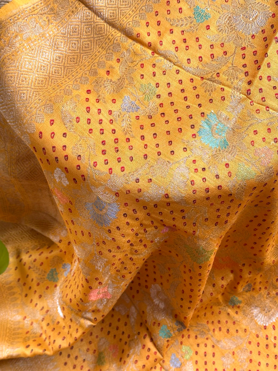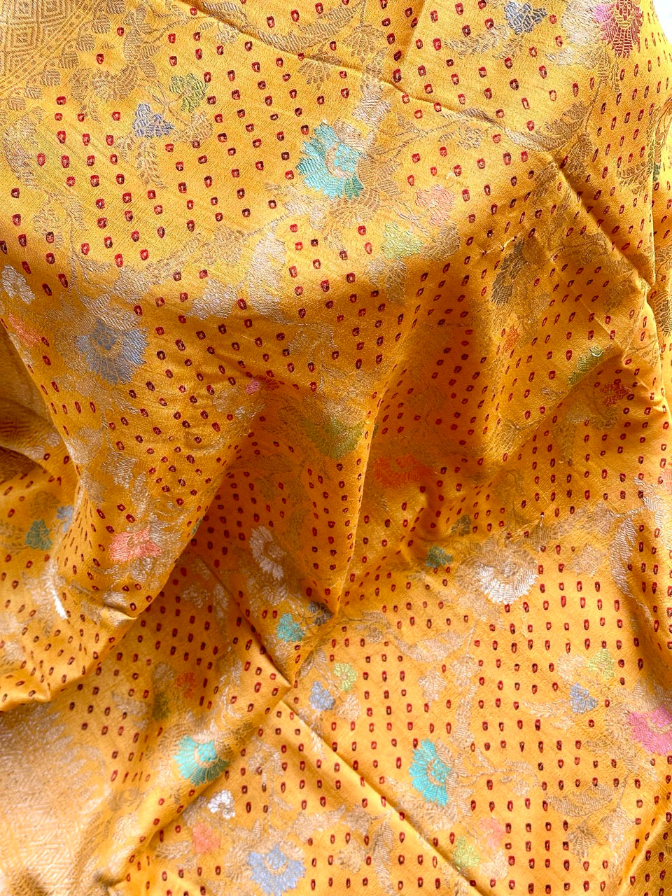 Kumudini - Kesar Mustard Yellow Handloom Munga Silk Bandhani Saree is backordered and will ship as soon as it is back in stock.