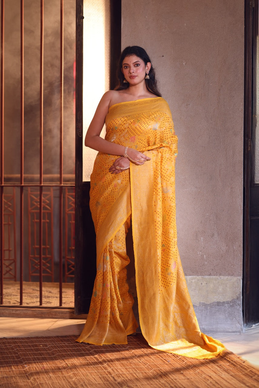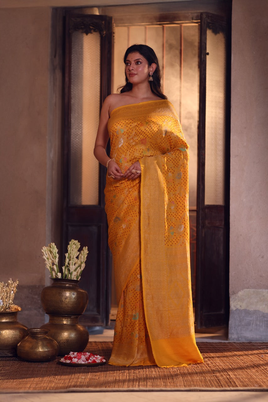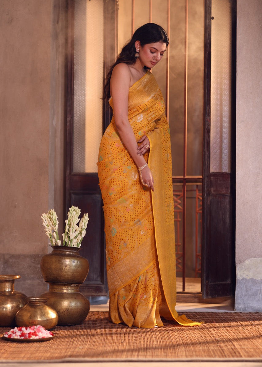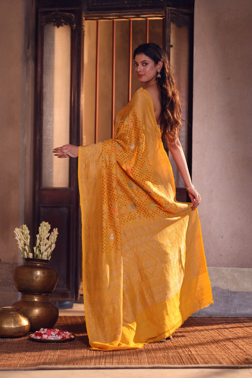 Kumudini - Kesar Mustard Yellow Handloom Munga Silk Bandhani Saree