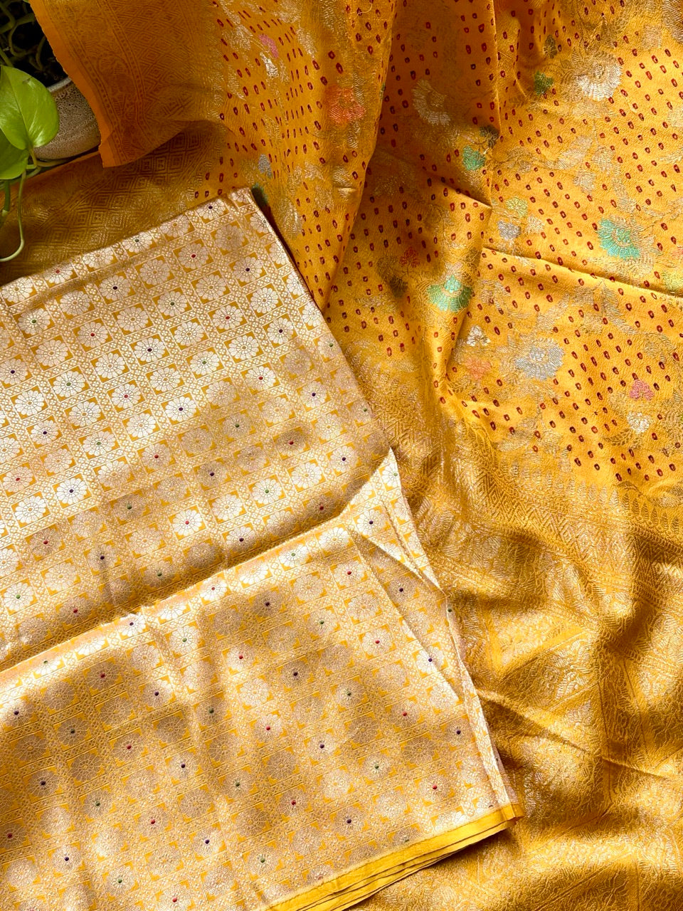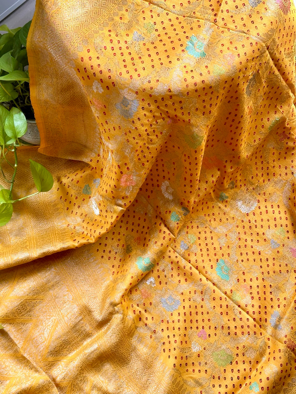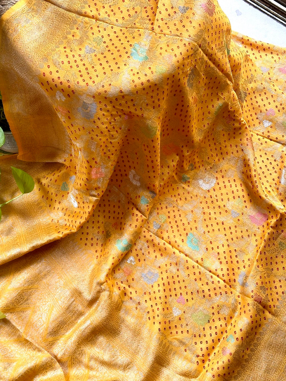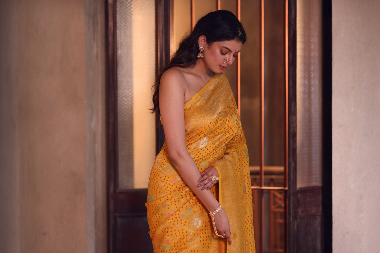 Kumudini - Kesar Mustard Yellow Handloom Munga Silk Bandhani Saree