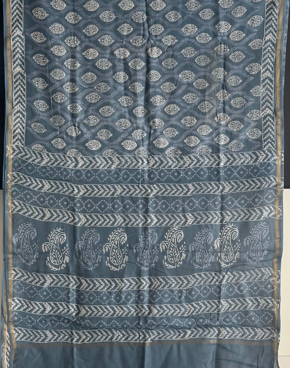 Light Steel Grey Handblock Print Chanderi Cotton Silk Saree
