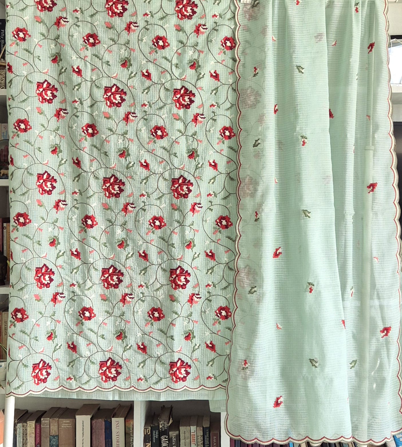 3-piece unstitched suit set. The back and sleeve of the suit is plain. Cross stitch inspired pretty roses embroidered fabric set in a beautiful sea-green-blue color. Subtle yet elegant.
