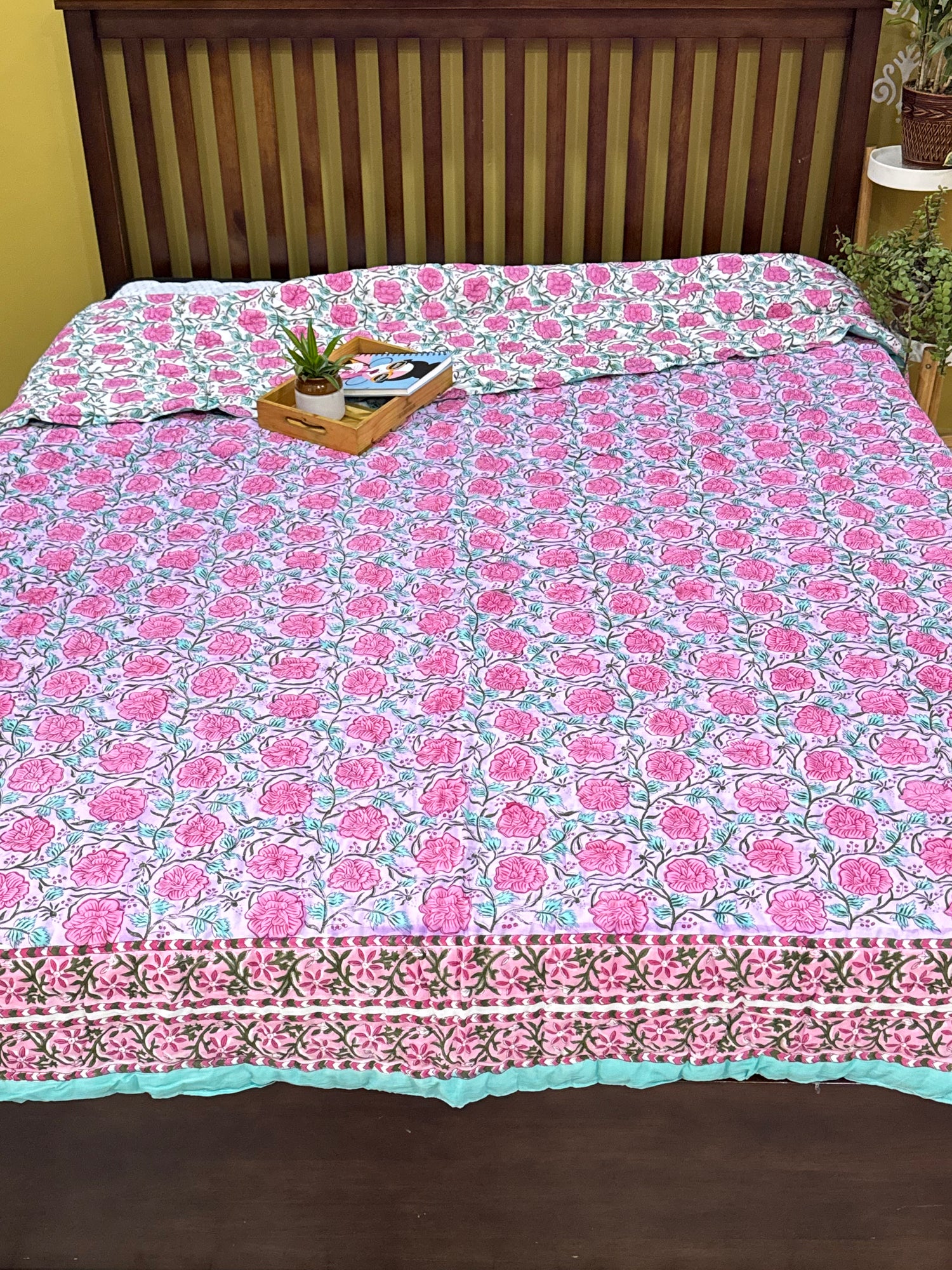 This Luxe Gardenloom handblock queen-size cotton quilt brings the softness of a blooming garden into your everyday rest. Crafted with breathable mulmul cotton on the outside and gently layered with loose white cotton inside, it offers cozy comfort without heaviness. Handmade block-printed botanical motifs in calming pinks and greens flow gracefully across the surface. Soft quilting adds warmth while remaining light and airy.