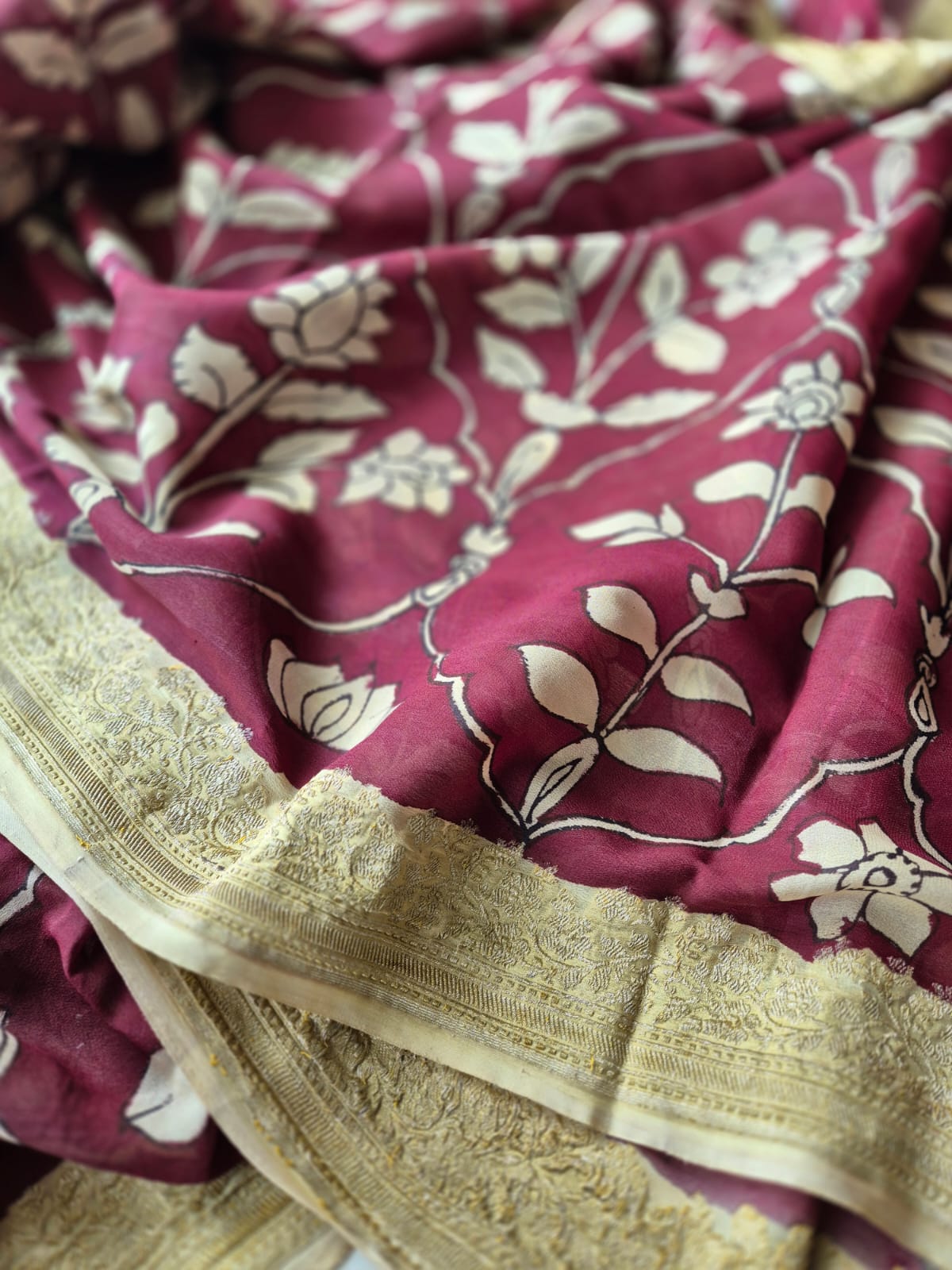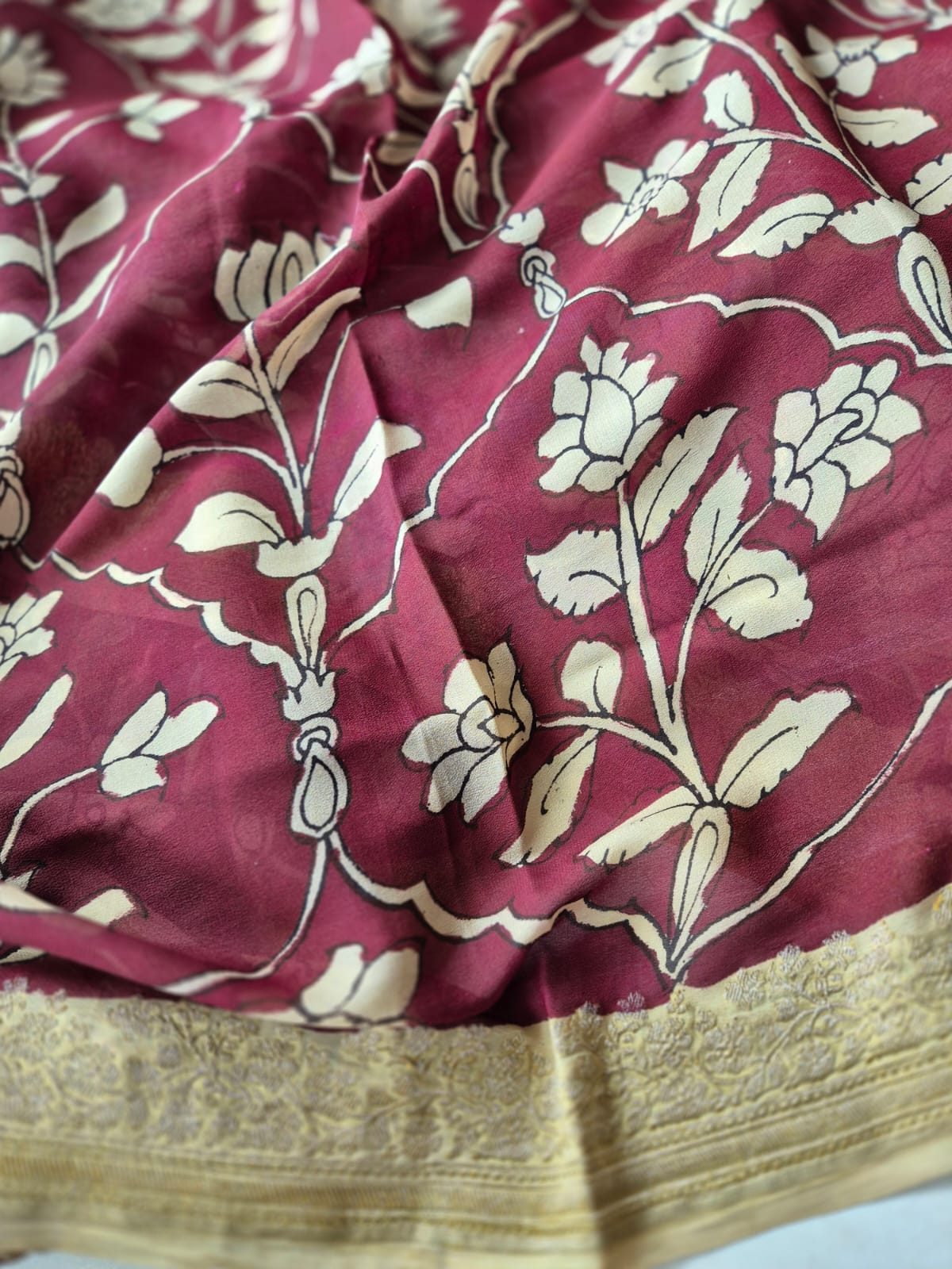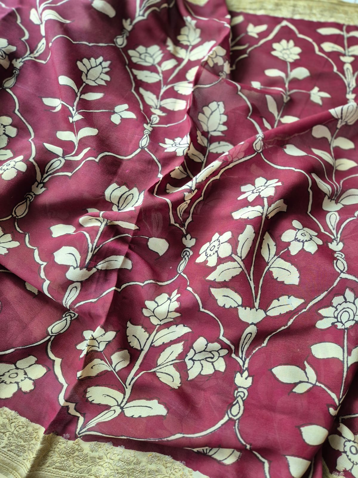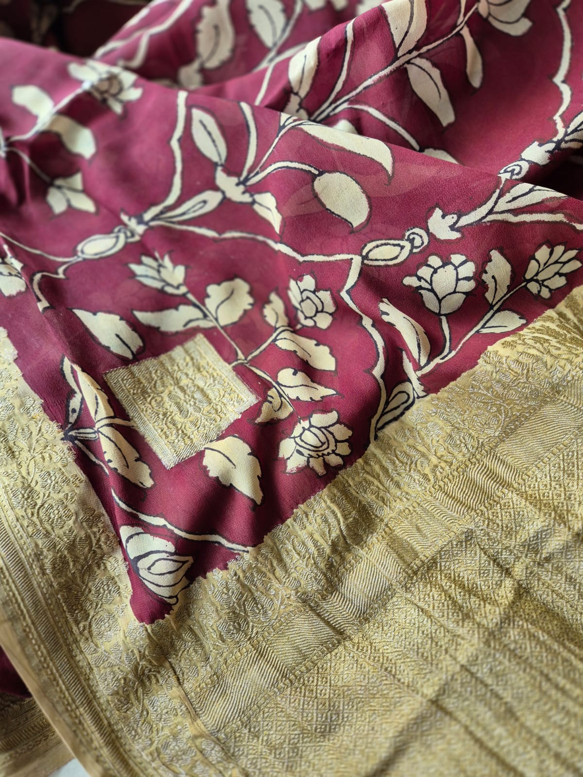 Maroon Mughlai Floral Pure Banarsee Georgette Kalamkari Saree