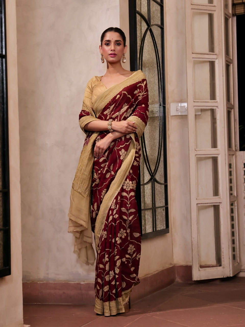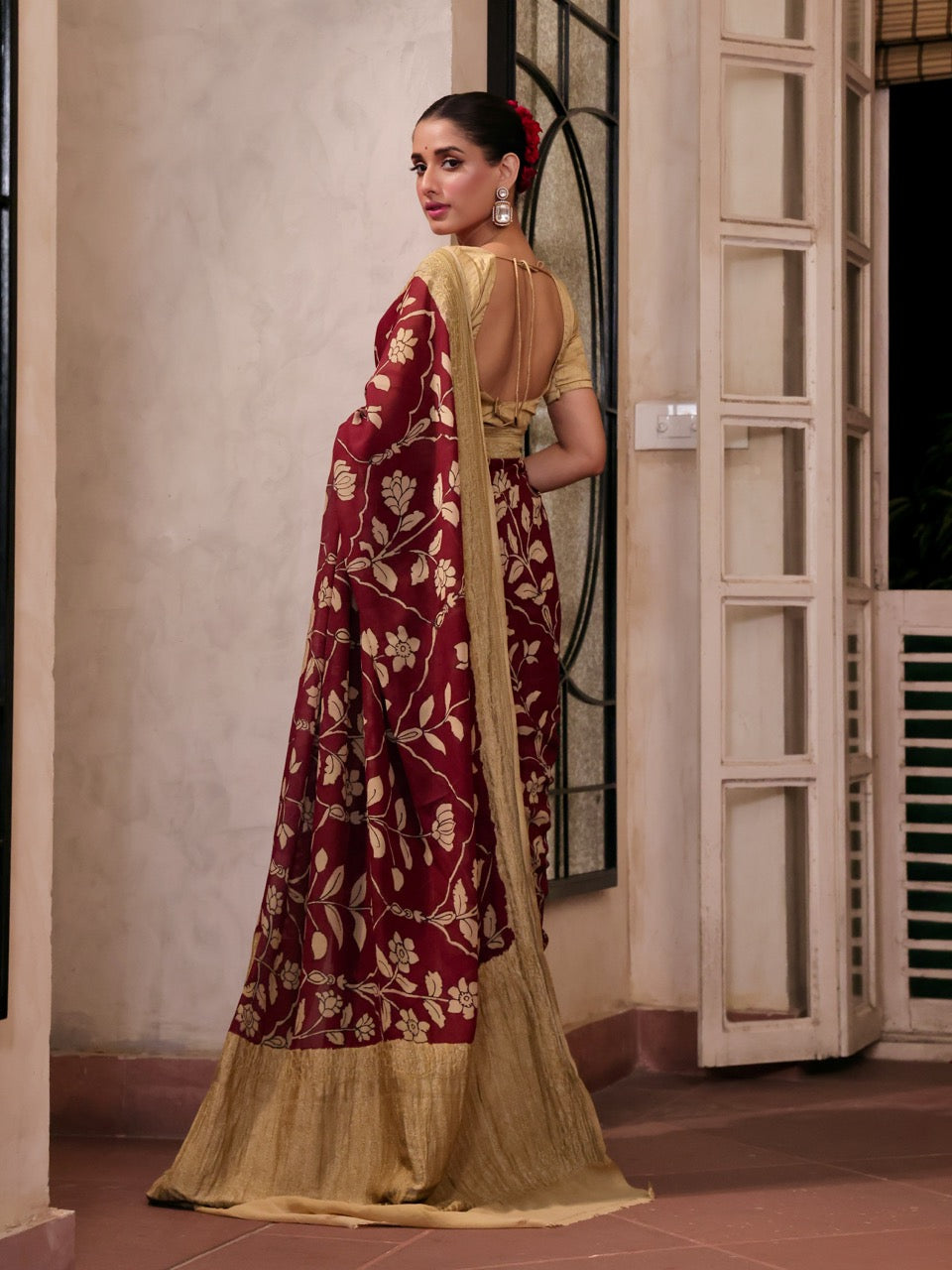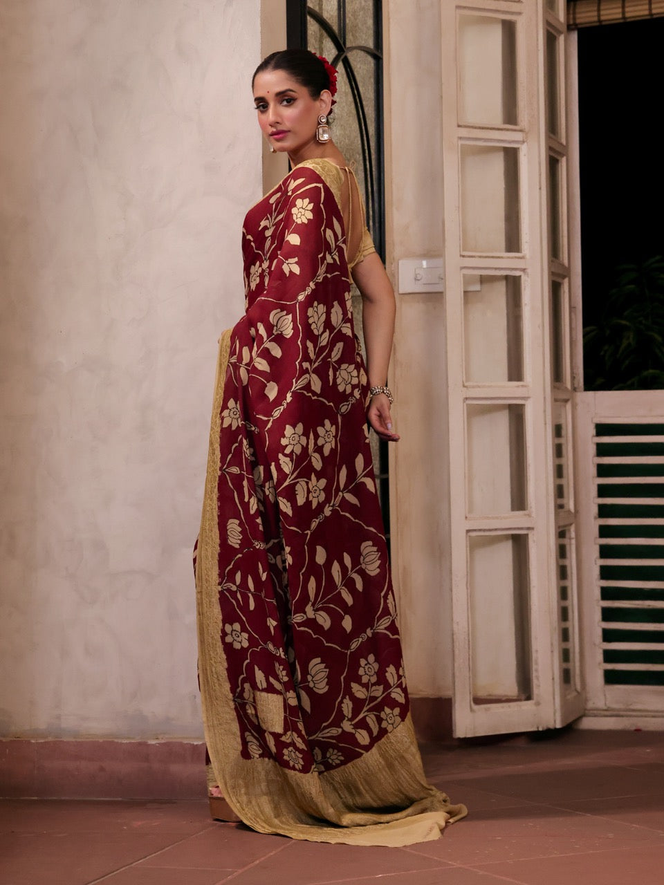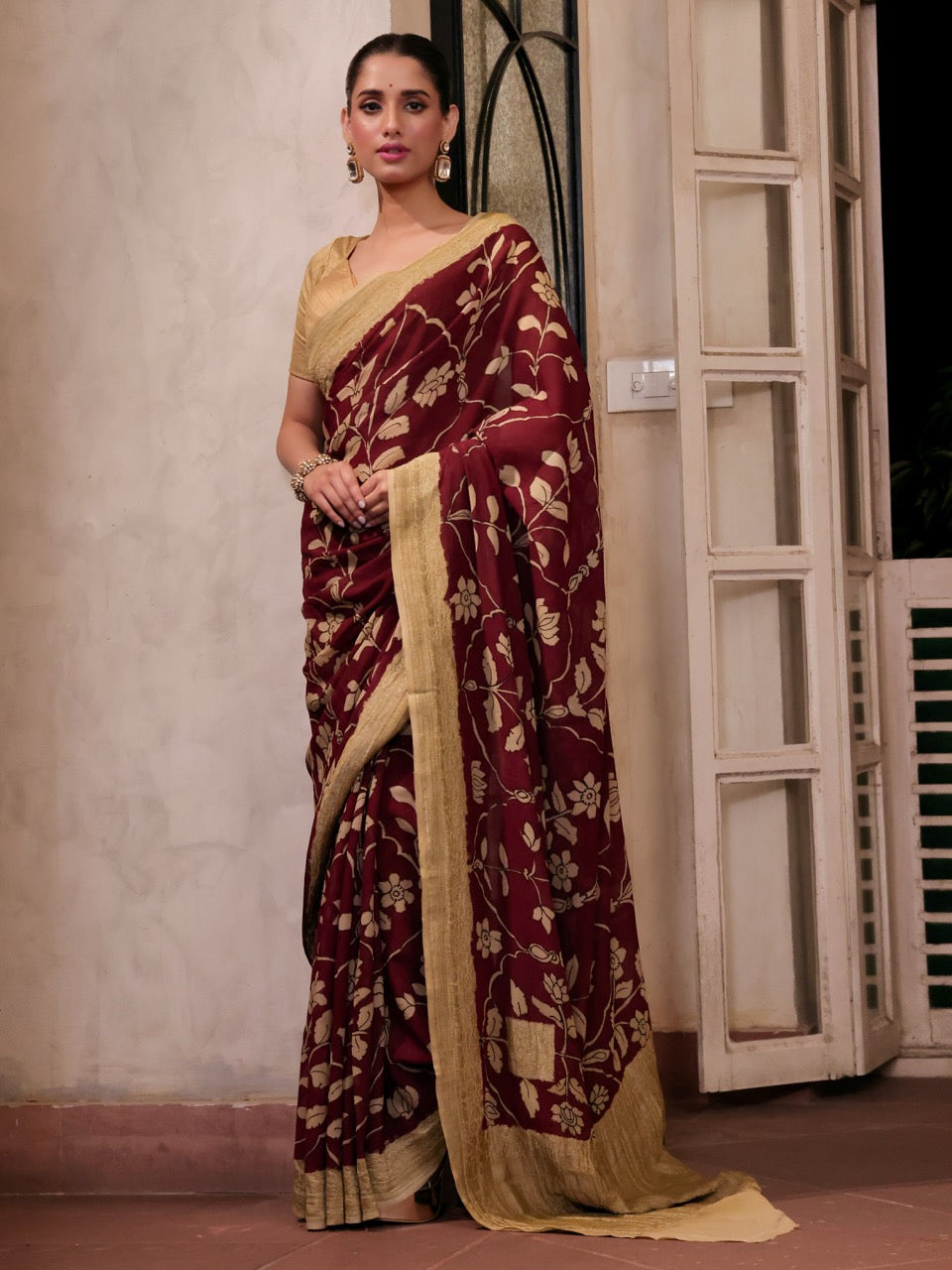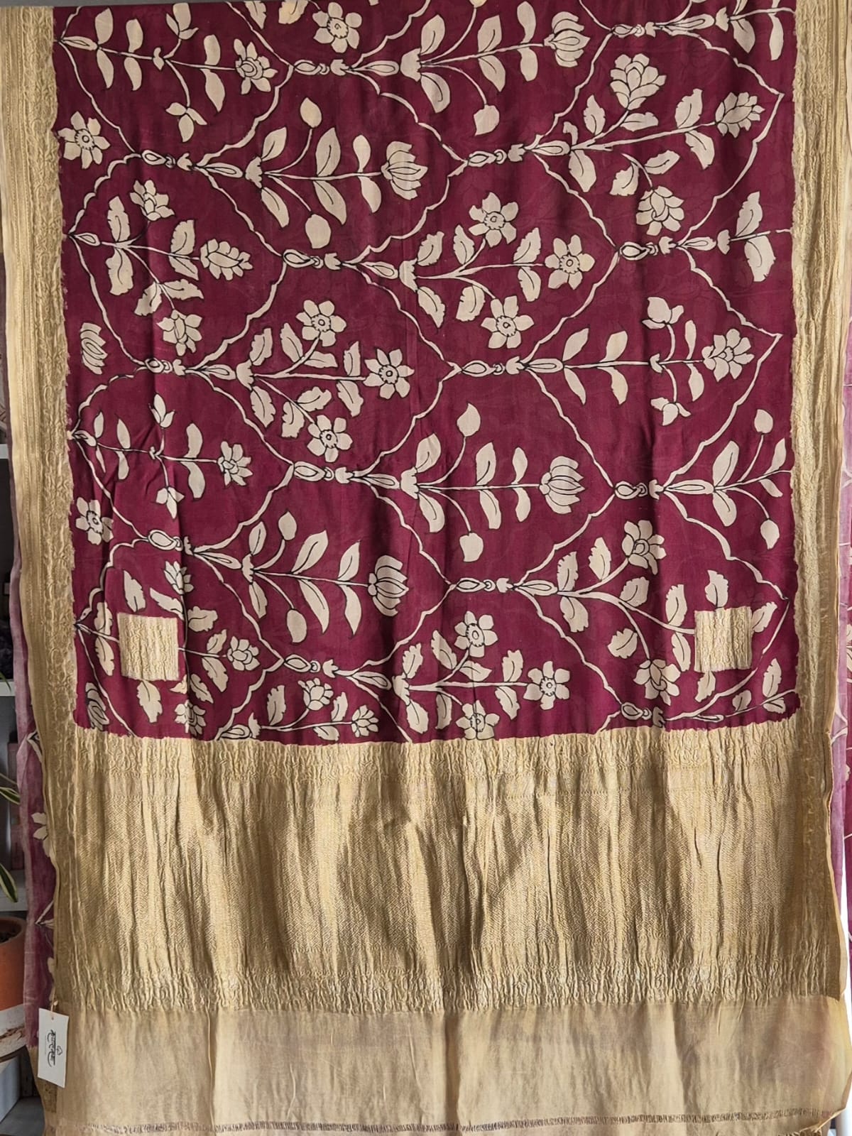 Maroon Mughlai Floral Pure Banarsee Georgette Kalamkari Saree