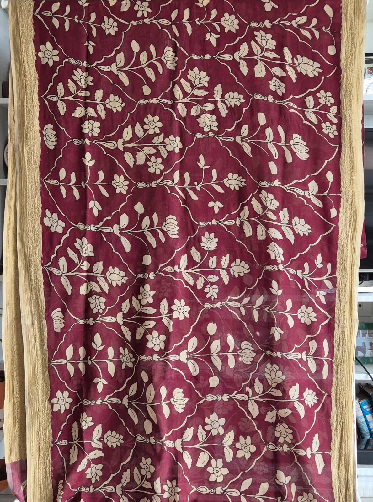 Maroon Mughlai Floral Pure Banarsee Georgette Kalamkari Saree is backordered and will ship as soon as it is back in stock.