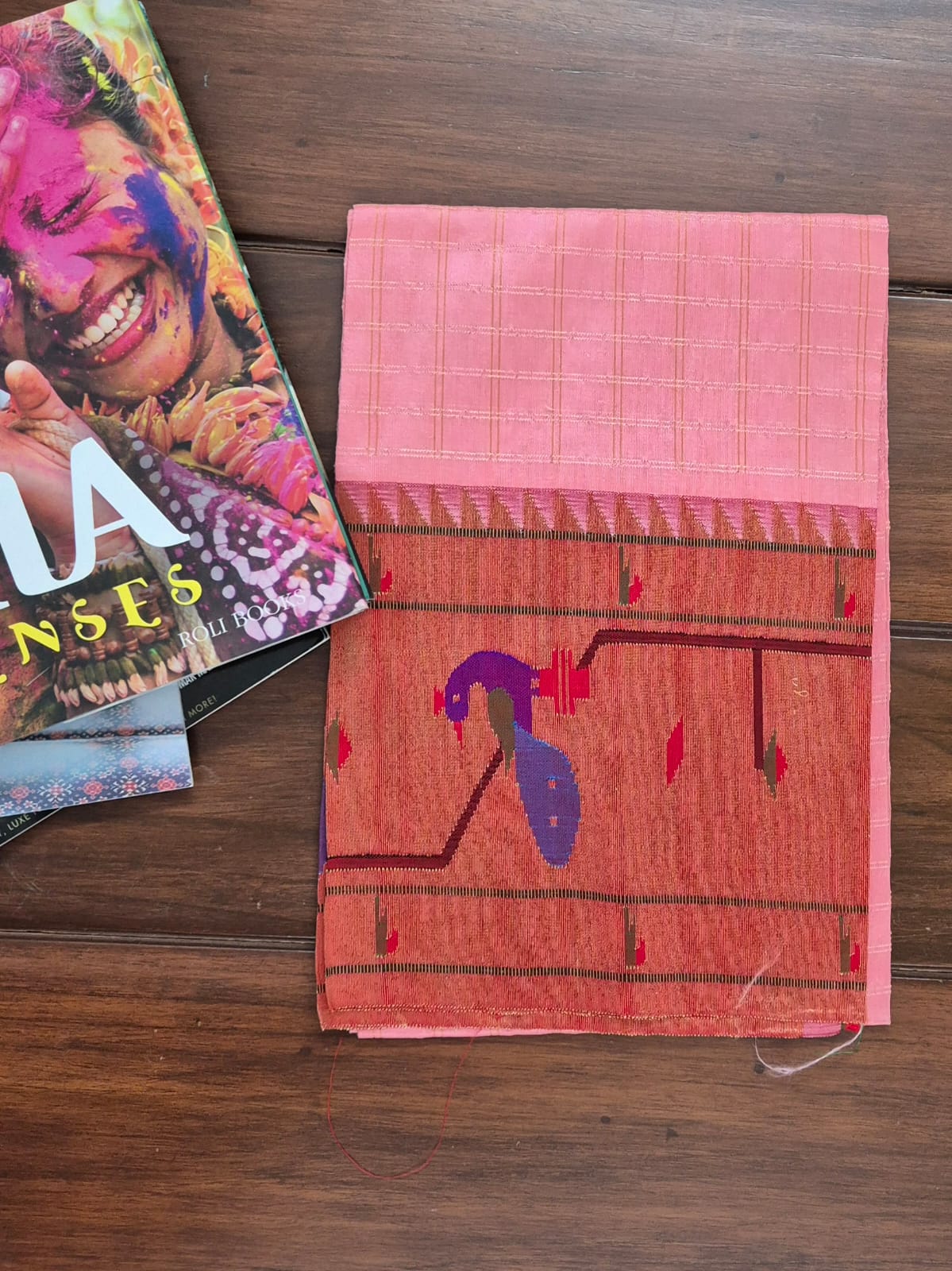 Soft, graceful, and effortlessly elegant, this Powder Pink handloom silk Paithani blouse piece is a celebration of subtle femininity. The muted pink base lends a calm sophistication, while the Paithani weave adds depth and texture without overpowering the color.