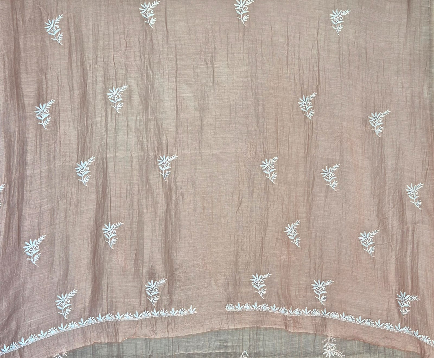 Unstitched Mul Chanderi Chikankari suit set adorned with intricate hand embroidery that exudes timeless charm and understated sophistication.