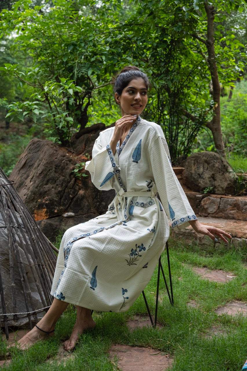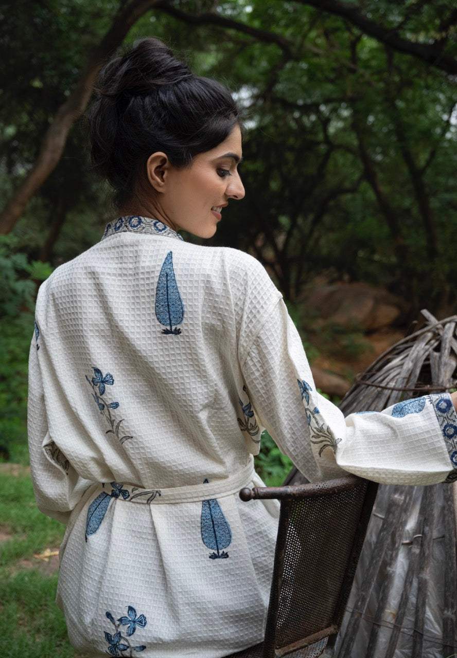 Mughal Flowers Inspired Cotton Waffle Handblock Printed Bath Robe