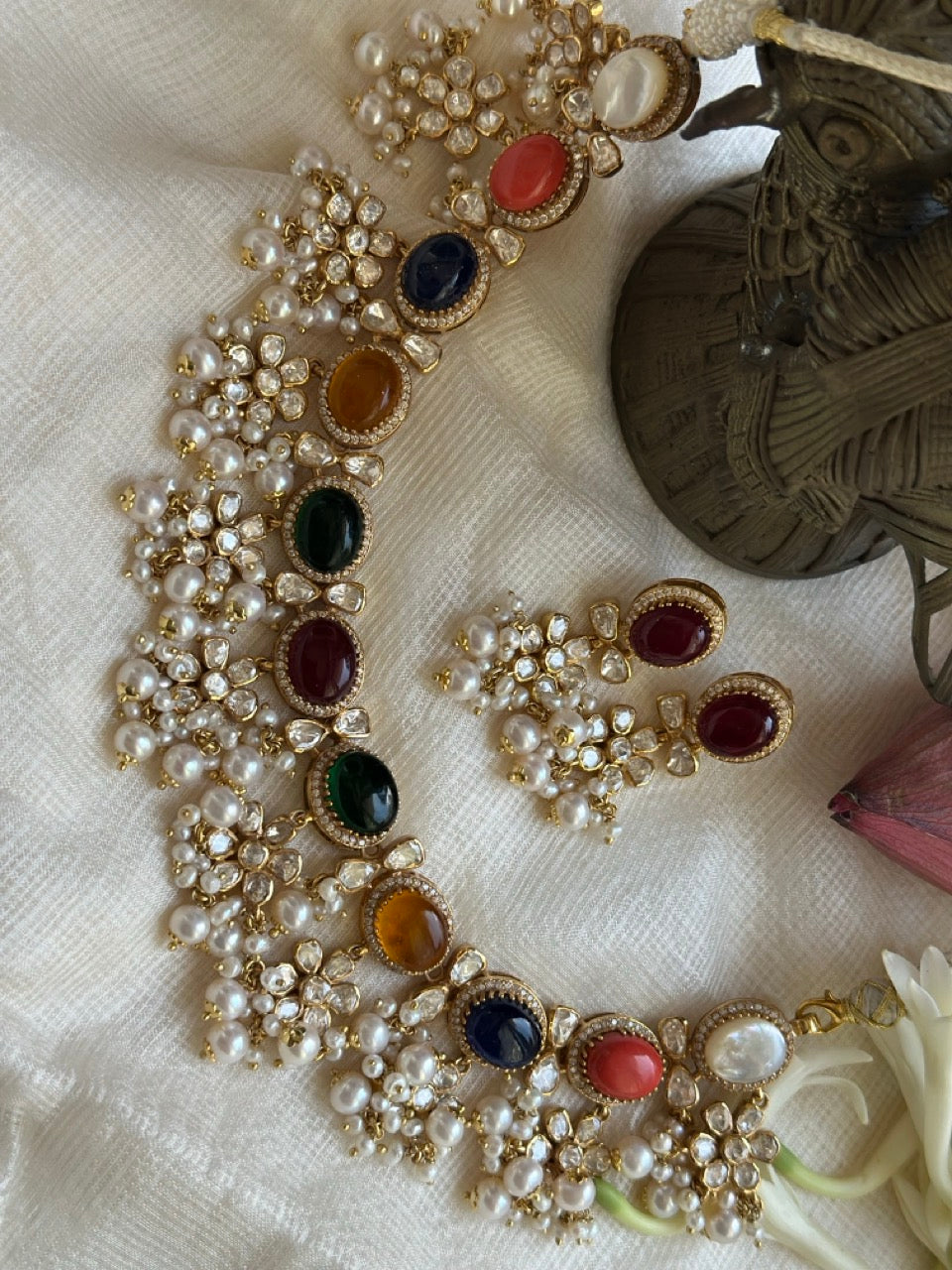 This magnificent 92.5 silver Navratna necklace set is a celebration of celestial beauty, featuring nine vibrant imitation gemstones symbolizing prosperity and balance. Each oval gem is bordered with delicate zircons and crowned with cascading pearls that exude timeless elegance. The Navya Ratna Haar blends divine tradition with regal artistry — a jewel that radiates auspicious charm and royal poise.