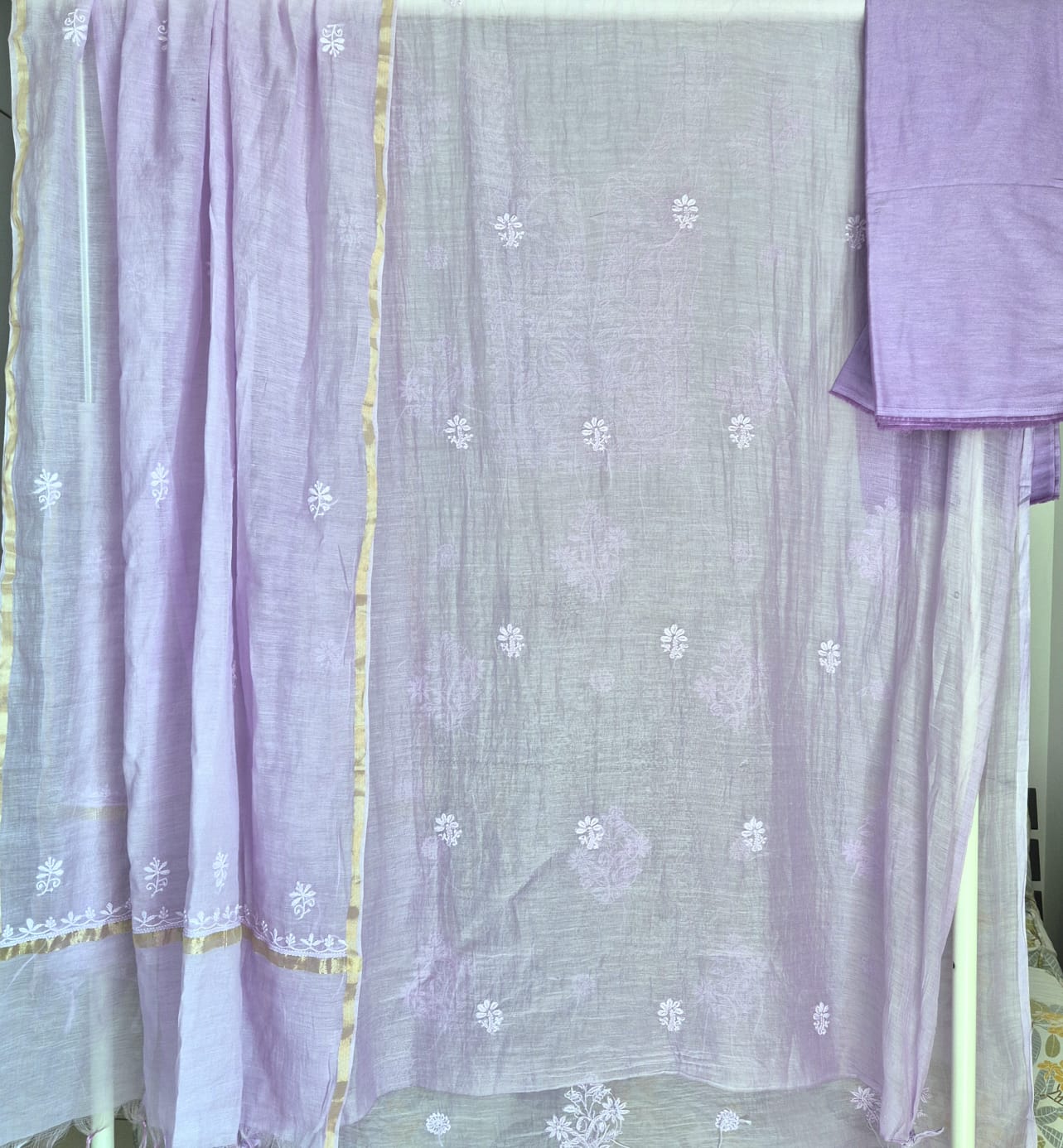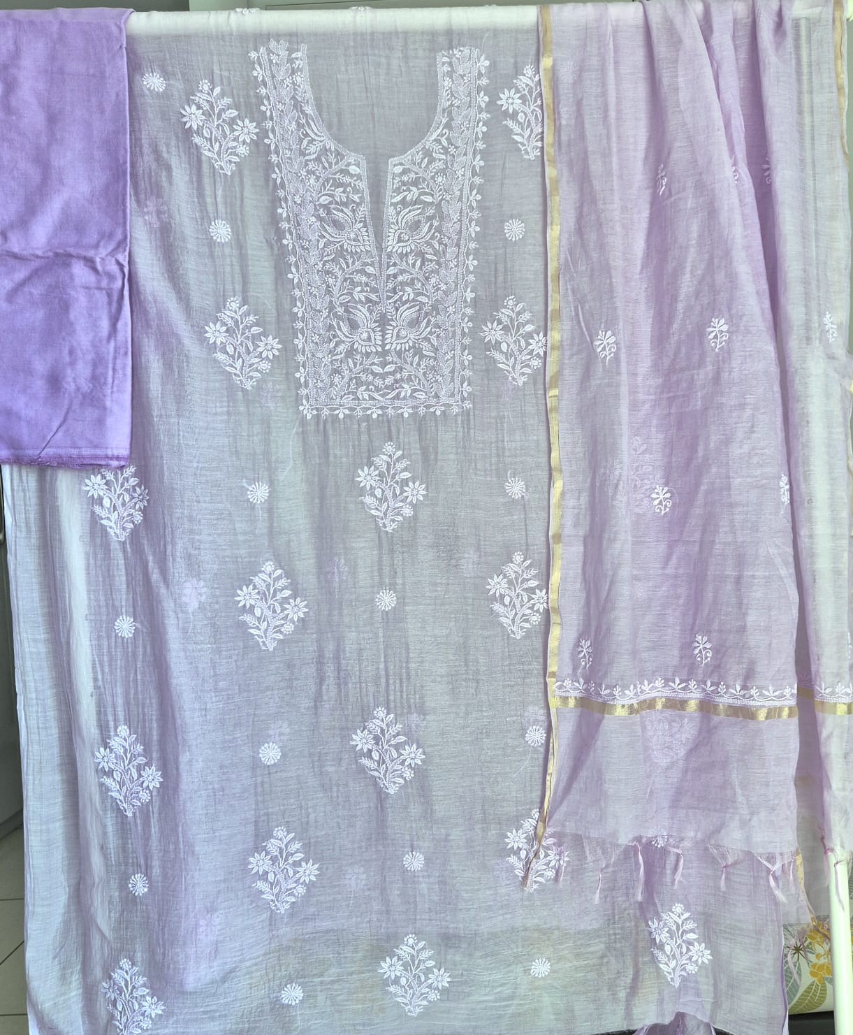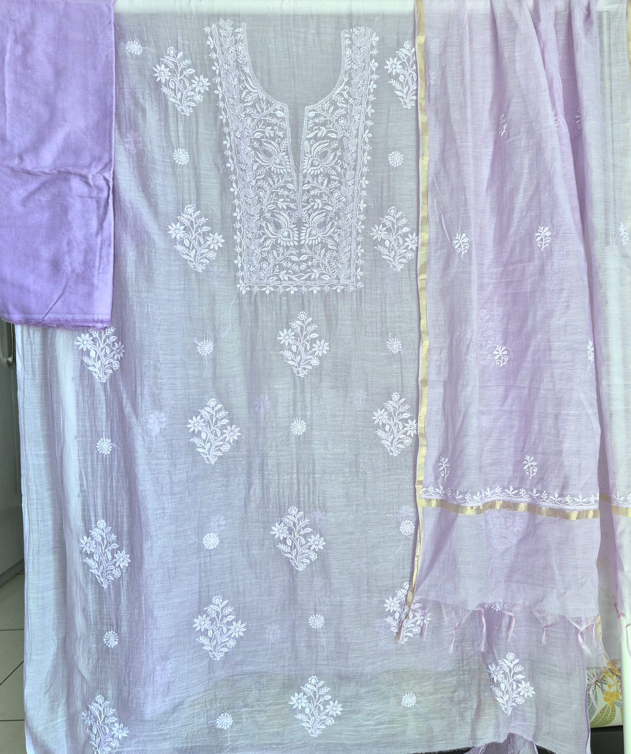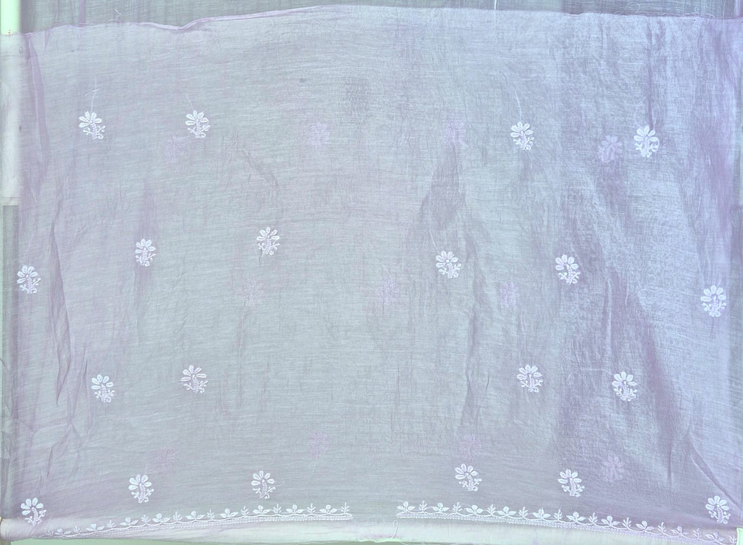 Unstitched Mul Chanderi Chikankari suit set adorned with intricate hand embroidery that exudes timeless charm and understated sophistication.