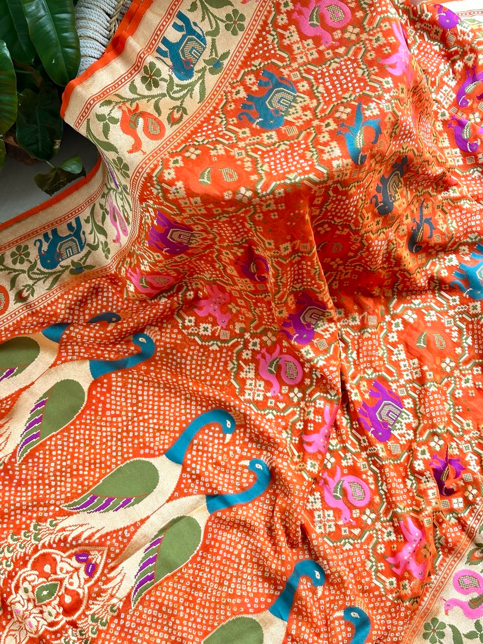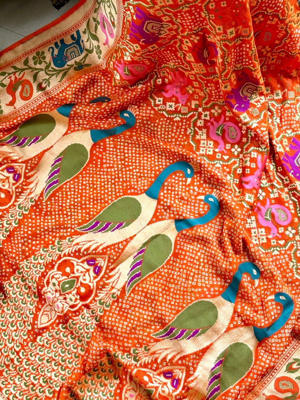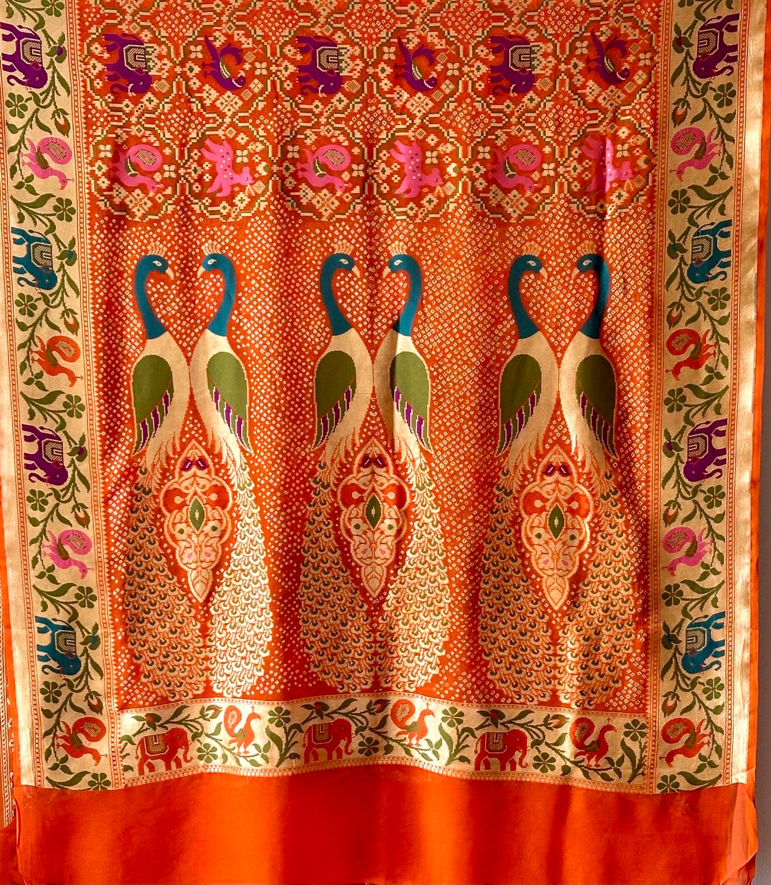 Orange Peacock Theme Patola Style Banarsi Gerogette Meenakari Bandhani Saree
