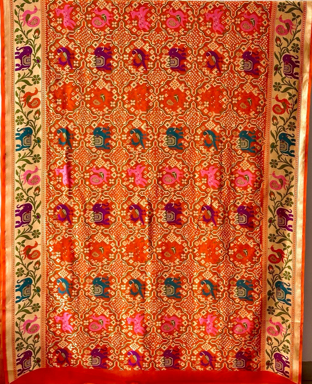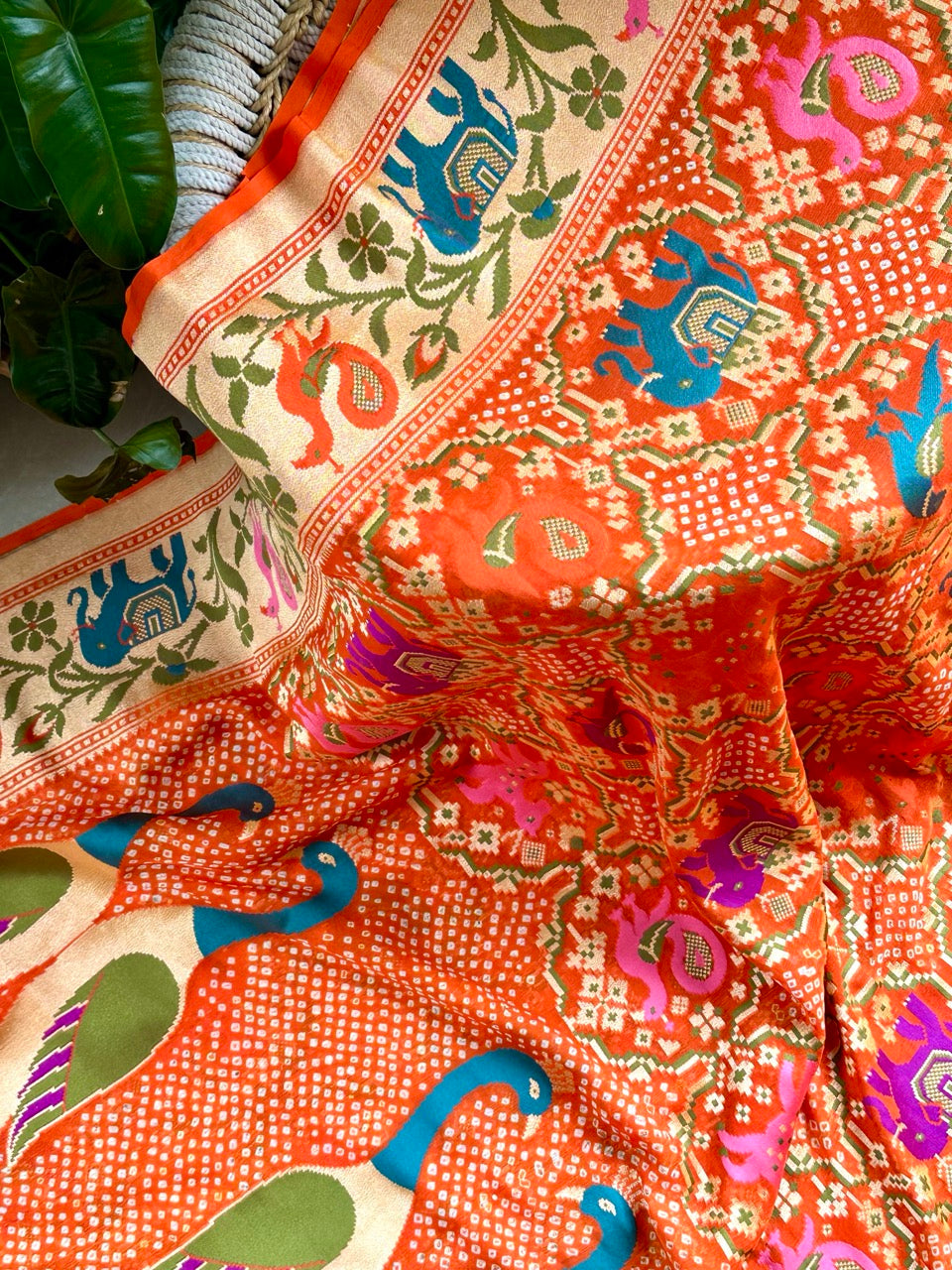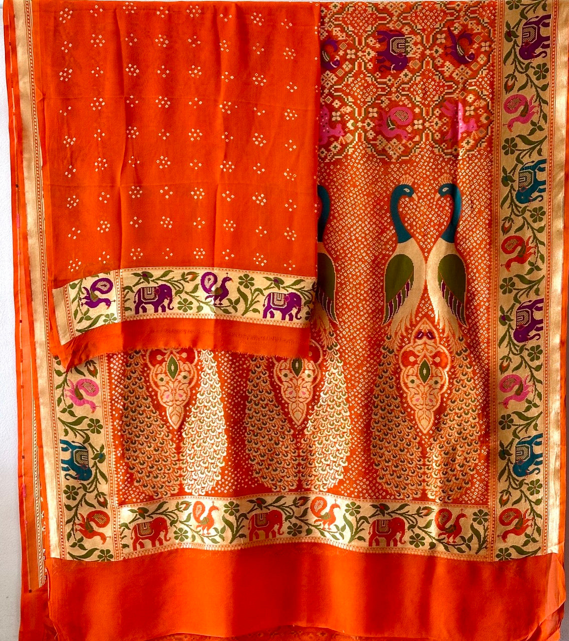 Orange Peacock Theme Patola Style Banarsi Gerogette Meenakari Bandhani Saree