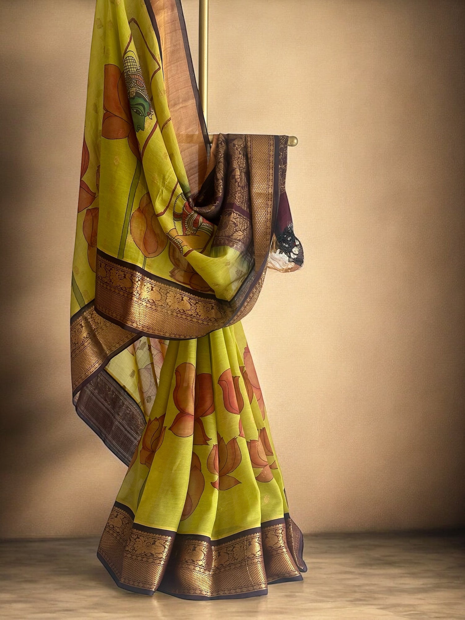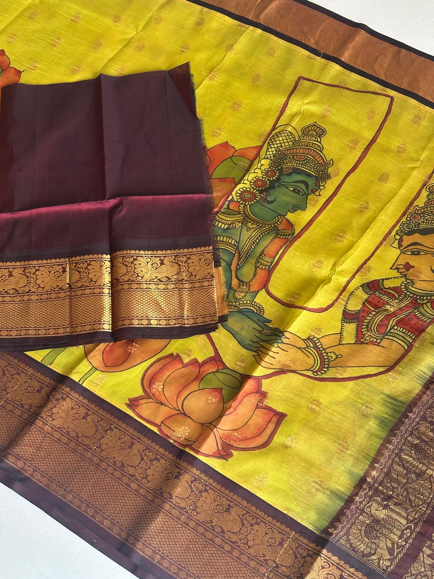 We meticulously capture these nuances in all our images. Due to the nature of the craft and the colors employed, Kalamkari is prone to bleeding. The 17-23 step Kalamkari process results in certain variations in the zari.