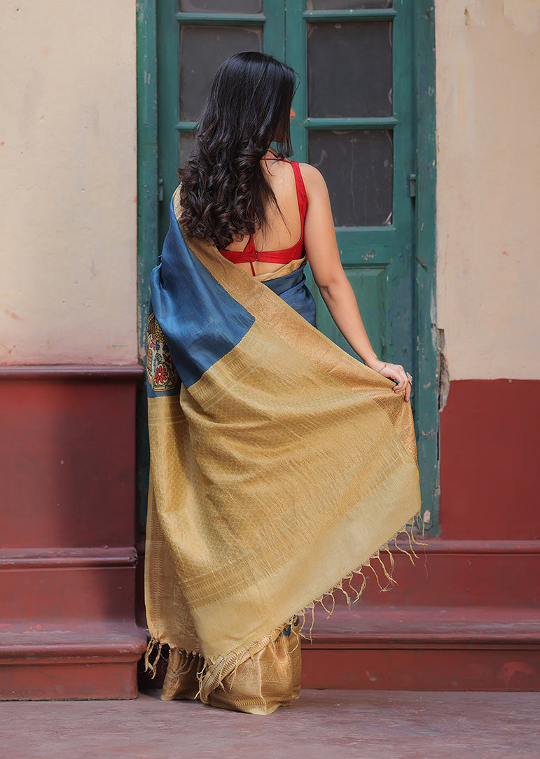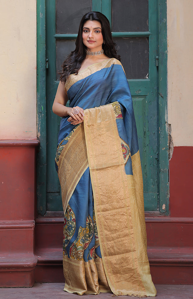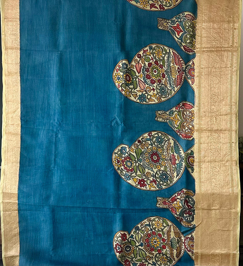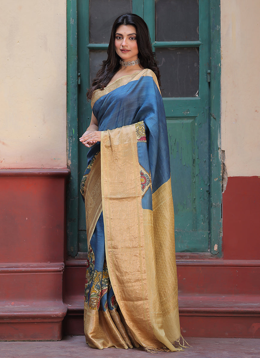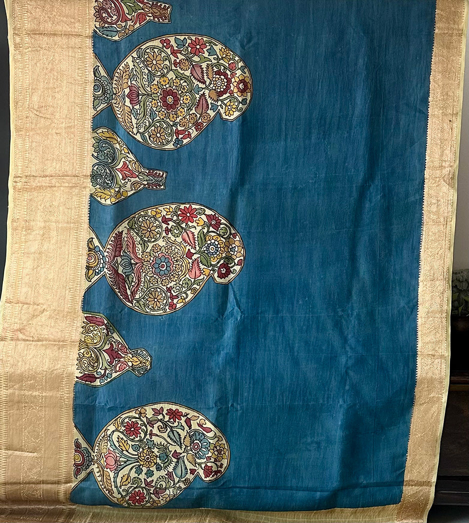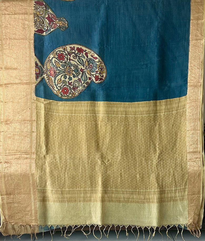 Paisleys with Floral Pattern Silk Kalamakari Saree in Blue Colour