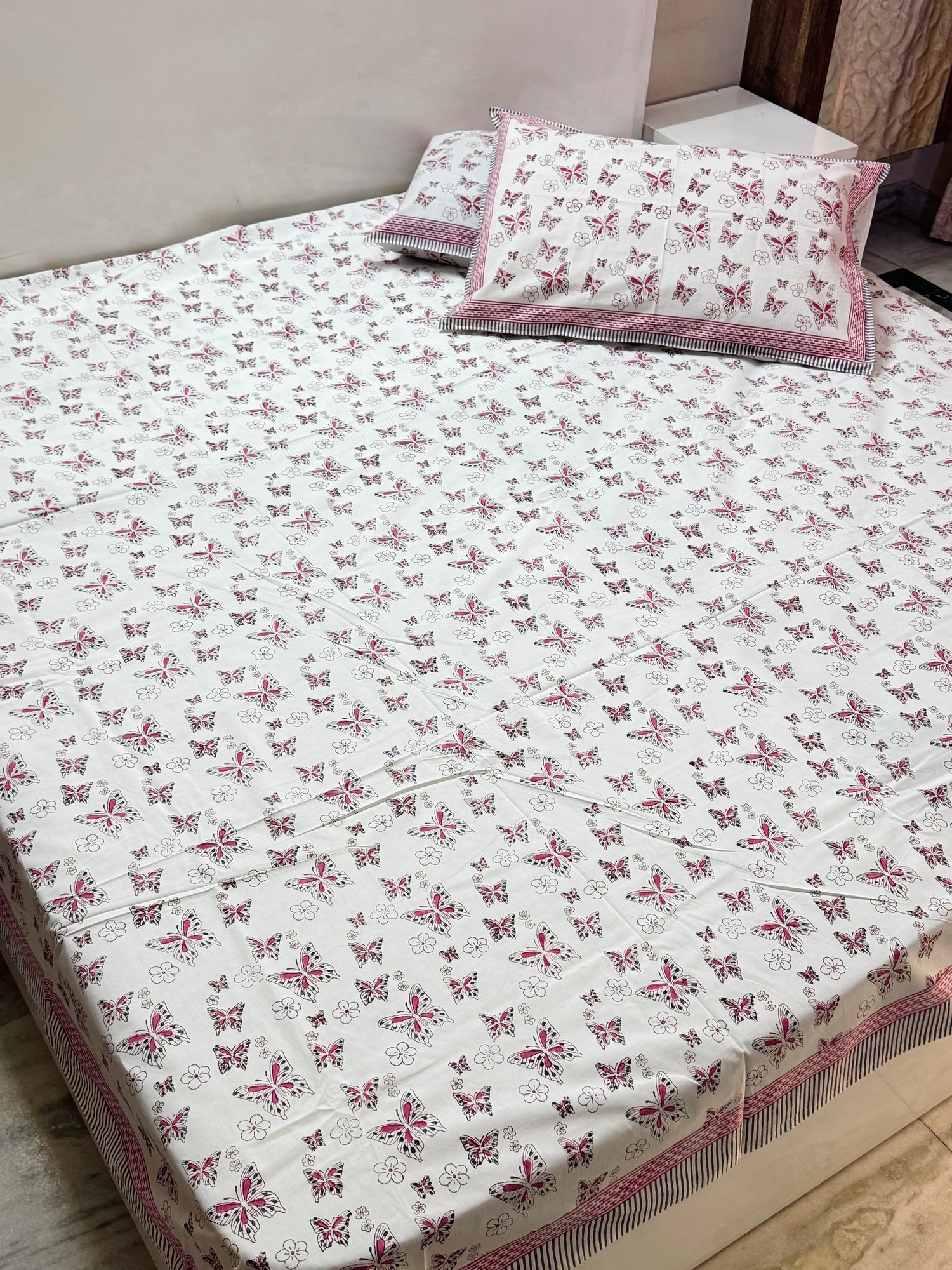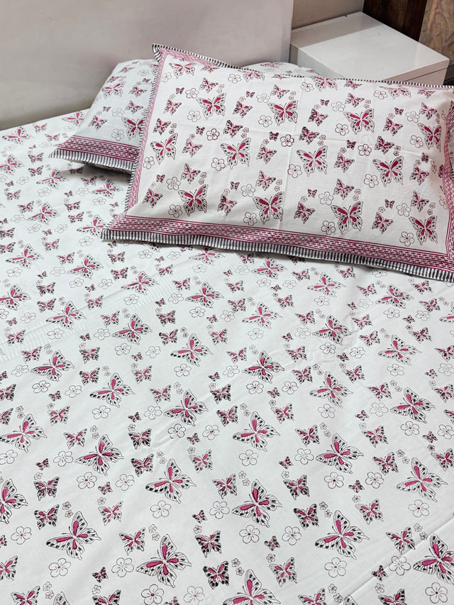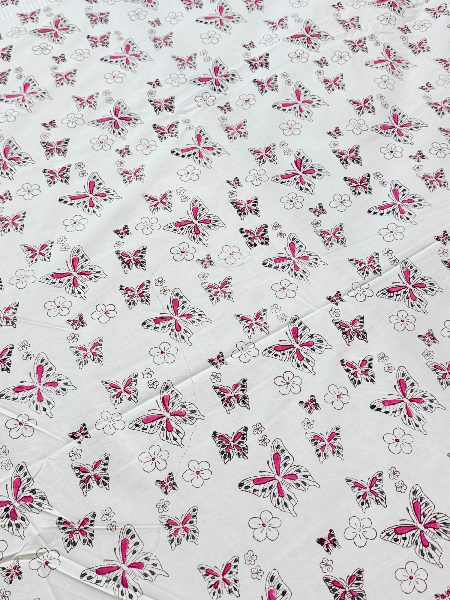 Pink Butterfly Handblock Printed Kids Cotton Bedsheet - King Size Bedsheet (108*108 inches)- FLAT is backordered and will ship as soon as it is back in stock.