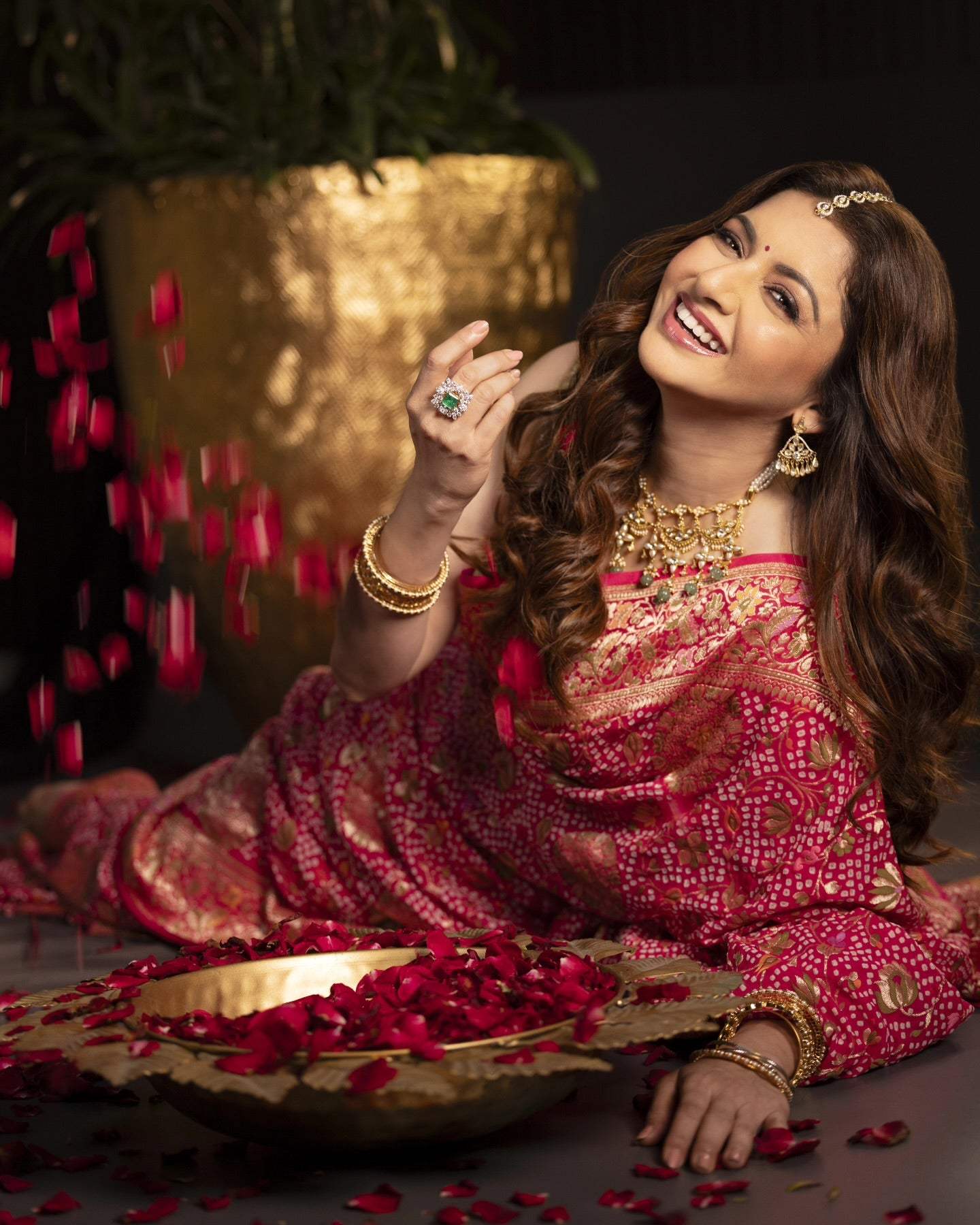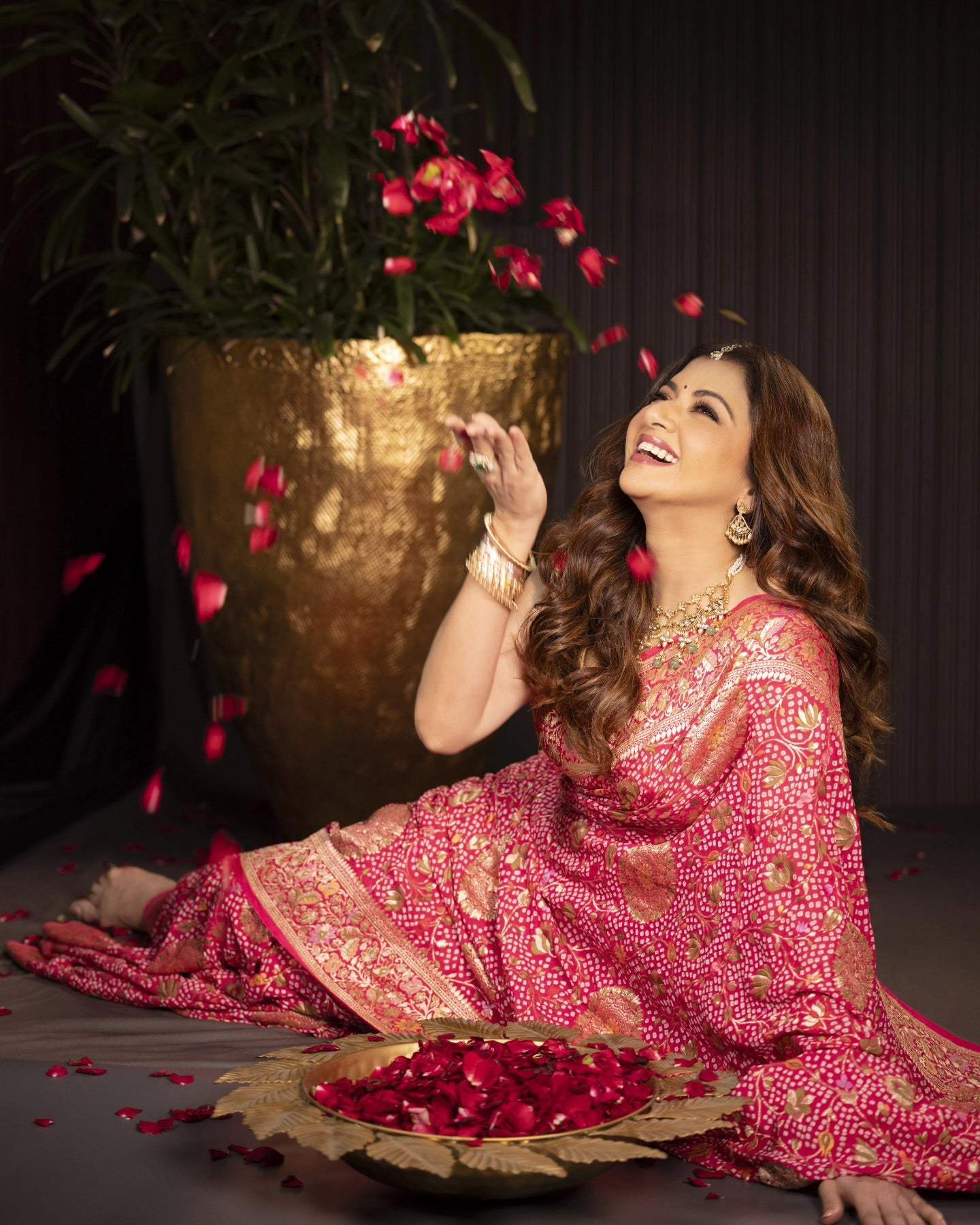 This is a very exclusive pure Banarasi georgette meenakari bandhani saree. It comes with an unstitched blouse piece. The saree is rolled in the pictures.