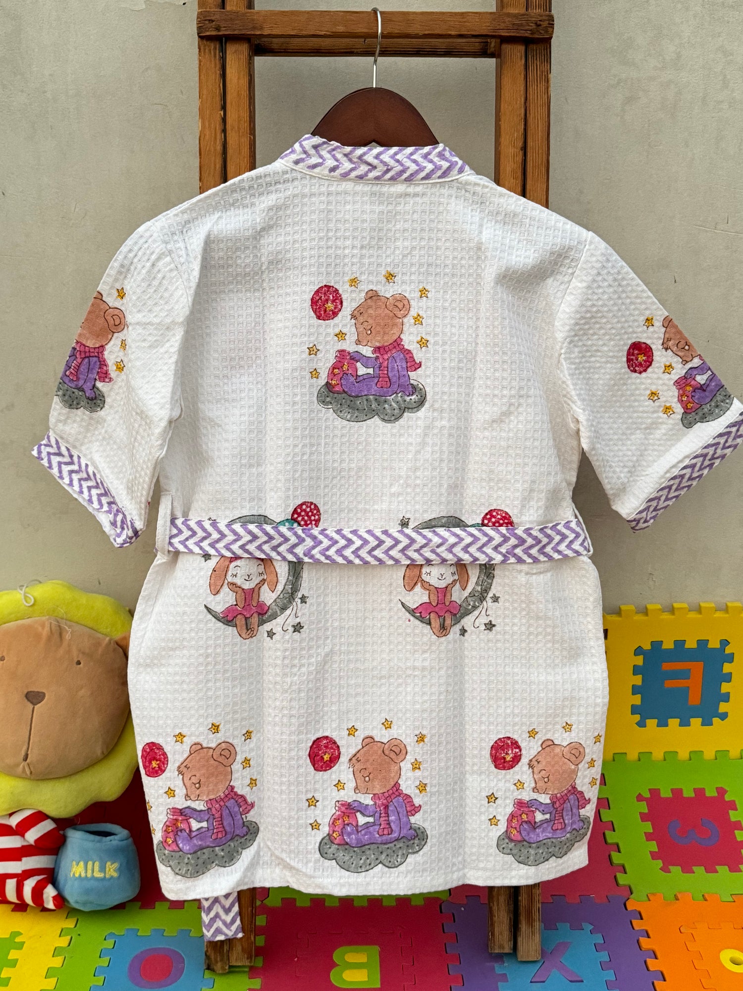 Wrap your little one in magical comfort with our Dreamy Moon & Stars Cotton Waffle Bathrobe for Girls. Handblock printed by skilled artisans of Jaipur, this bathrobe features a dreamy design with moon, stars, and teddy bear elements.