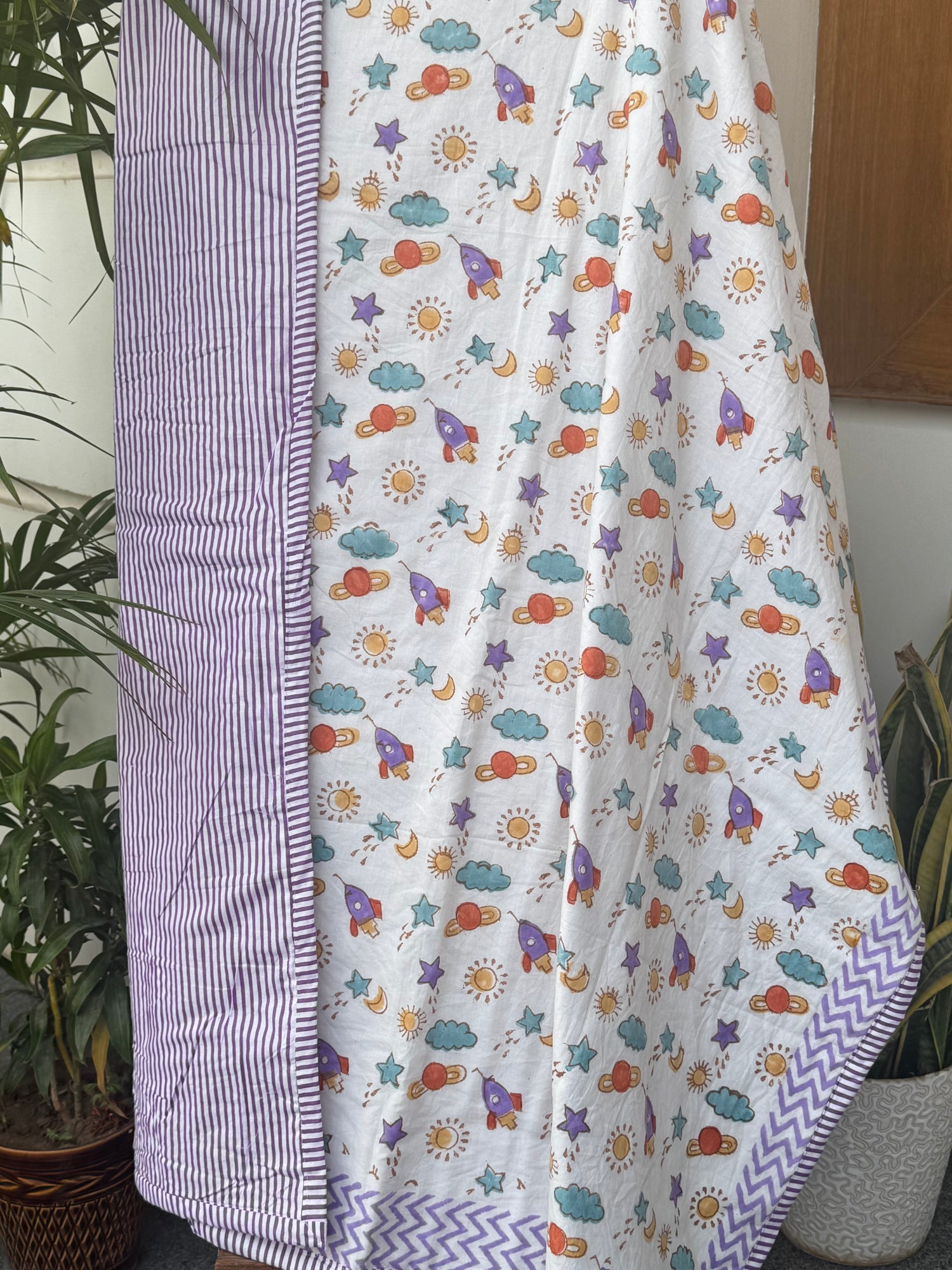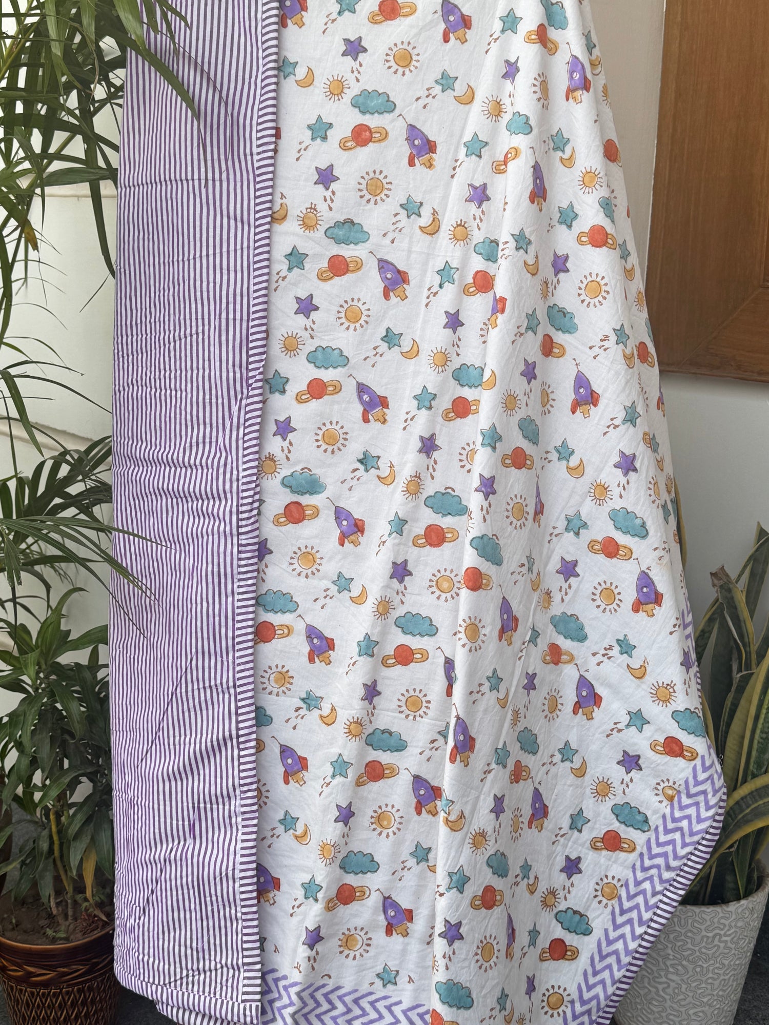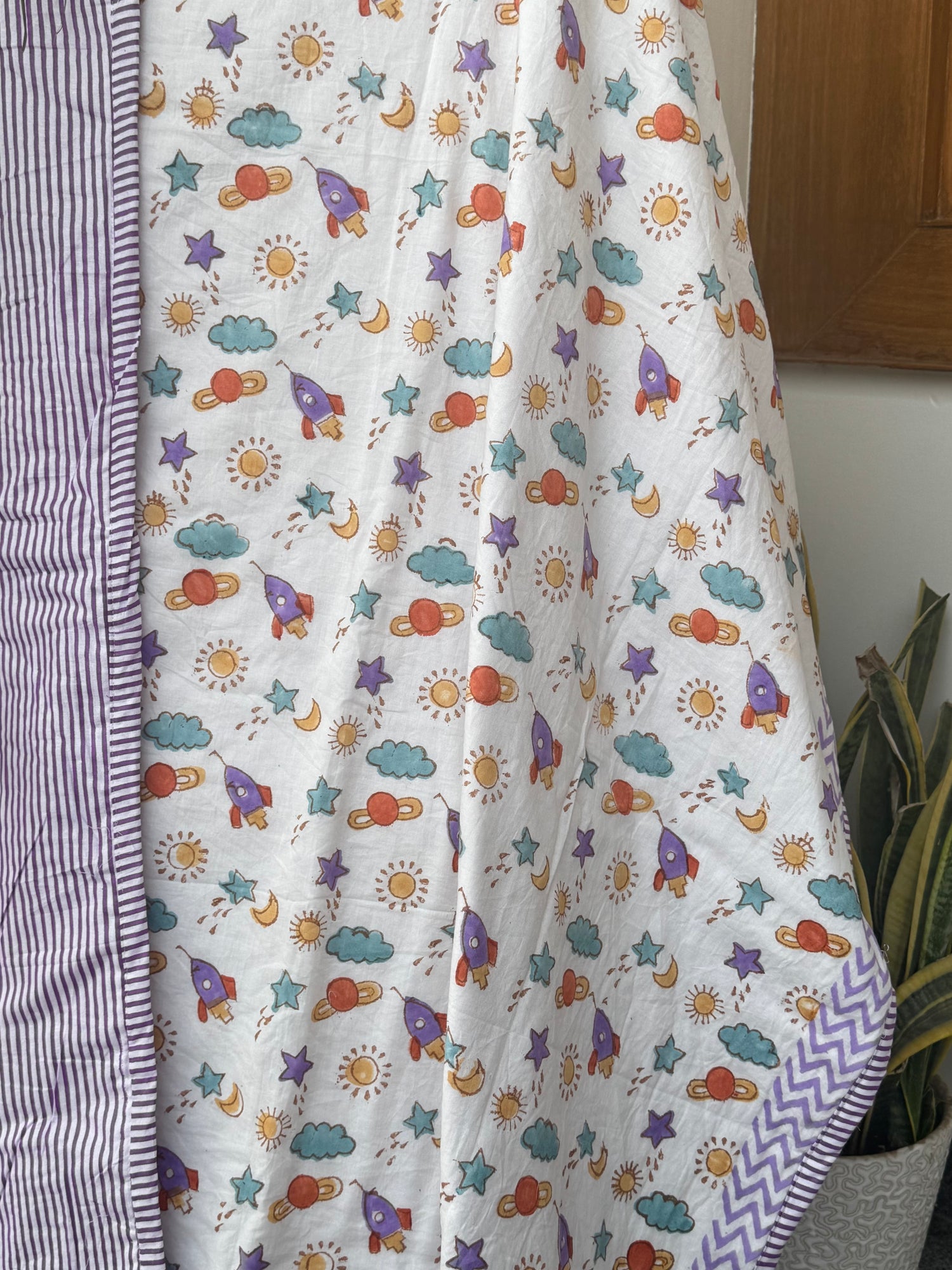 Blast Off to Cozy Dreams with Our Purple Space-Themed Layered Blanket (Dohar) for Kids