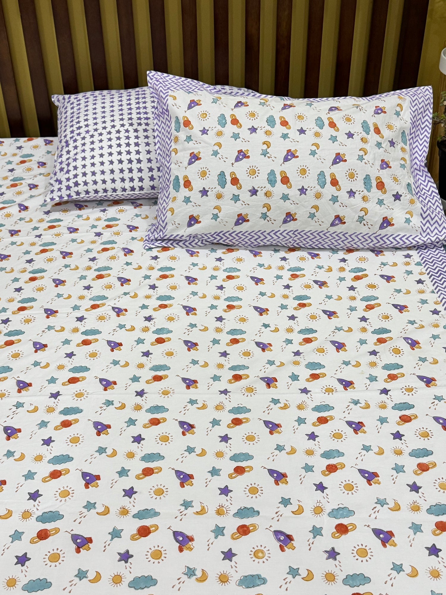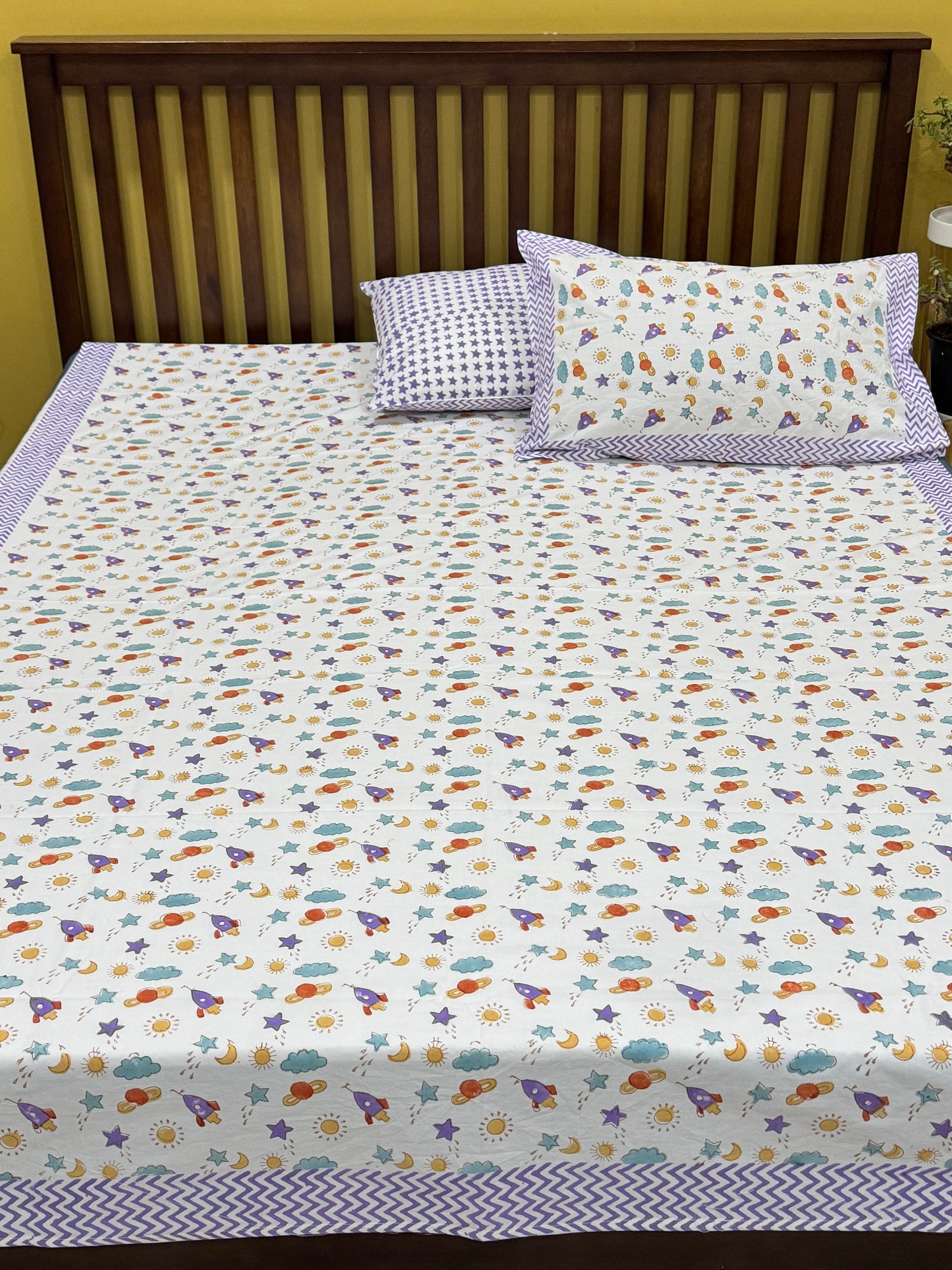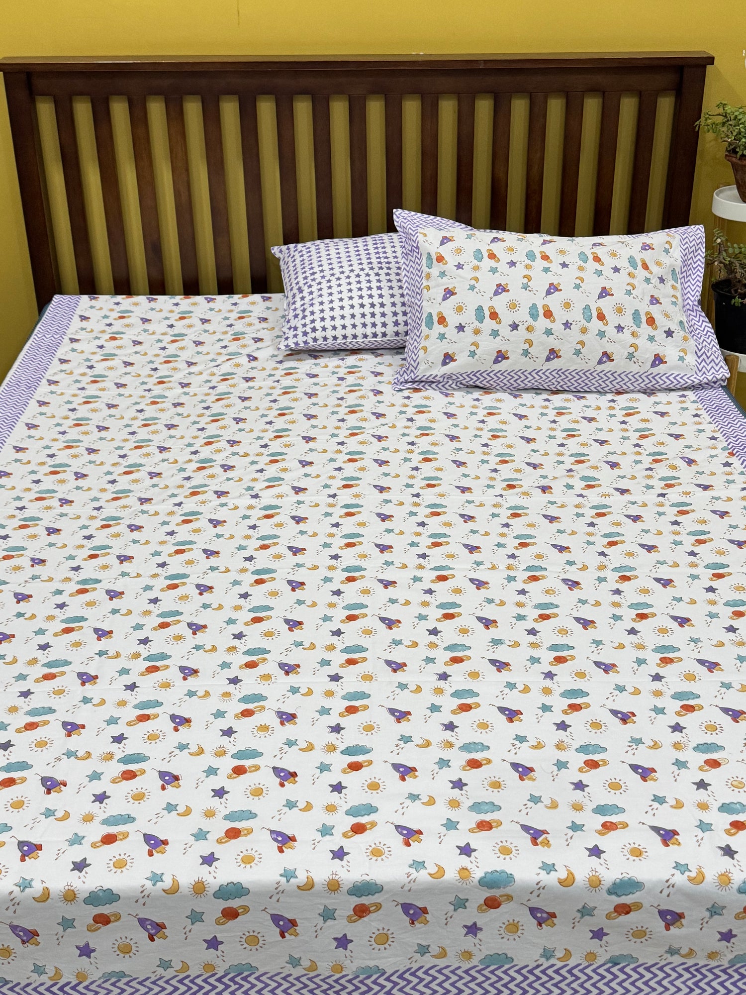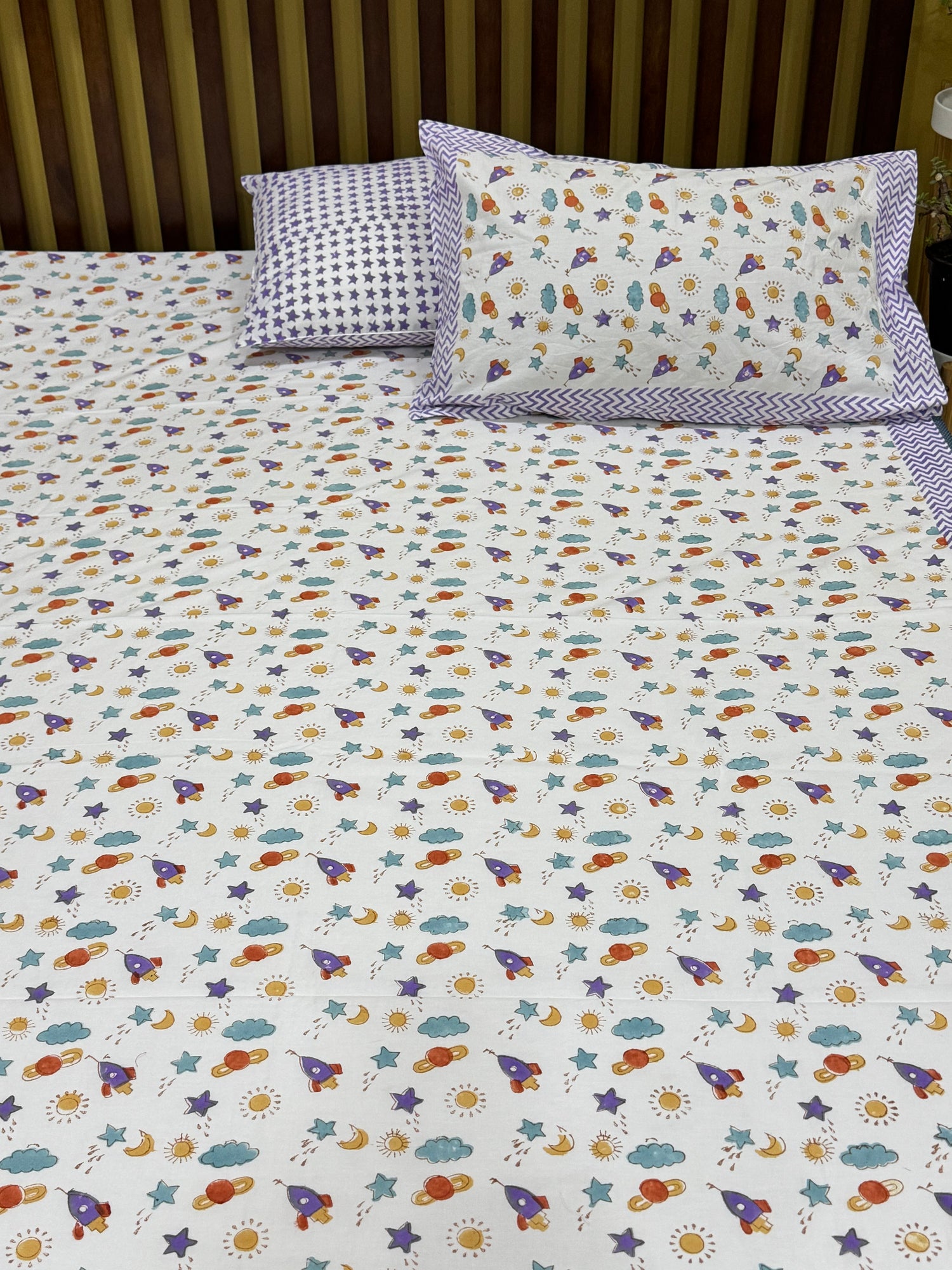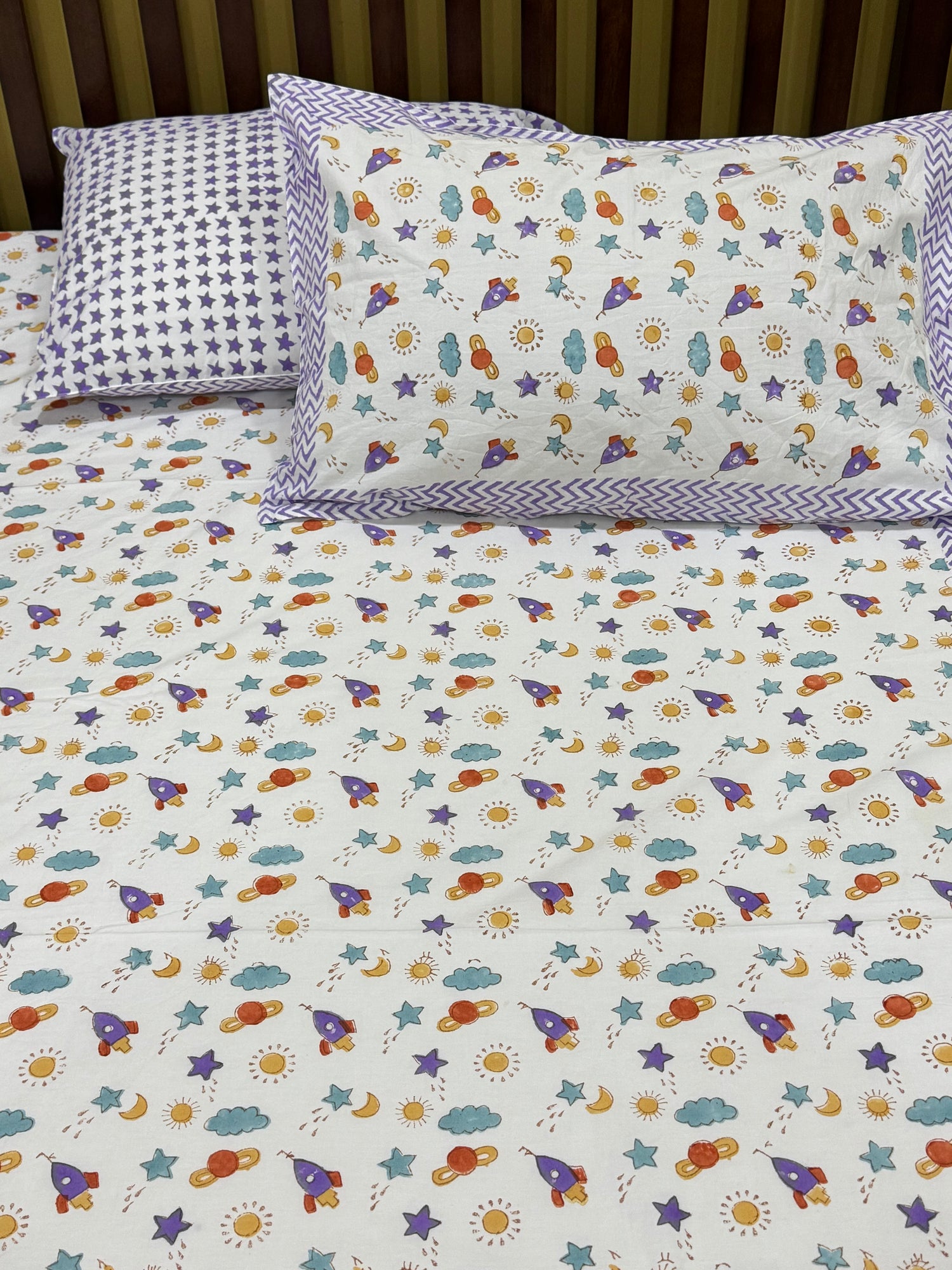 Purple Space rockets Handblock Printed Kids Cotton Bedsheet