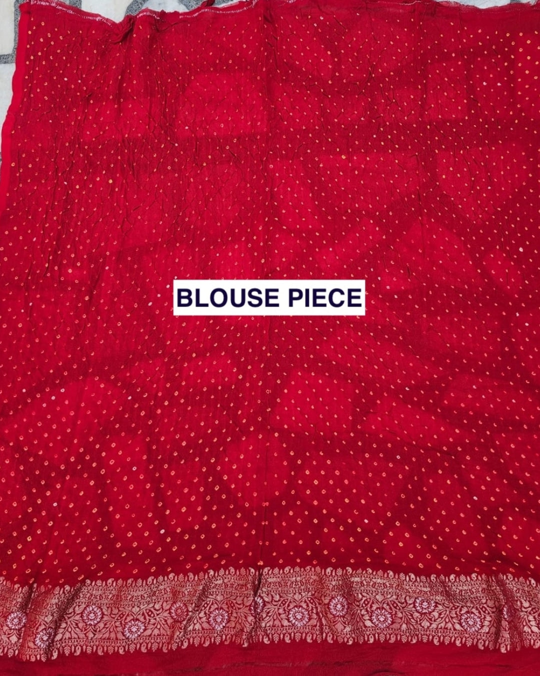 Bold, festive, and deeply rooted in tradition, this Bandhani saree in a striking red shade is a true celebration of Indian textile heritage. Crafted from pure Banarasi georgette, the saree offers an airy feel with a graceful flow. The intricate Bandhani technique, achieved through meticulous tie-dye artistry, creates captivating patterns that symbolize joy.