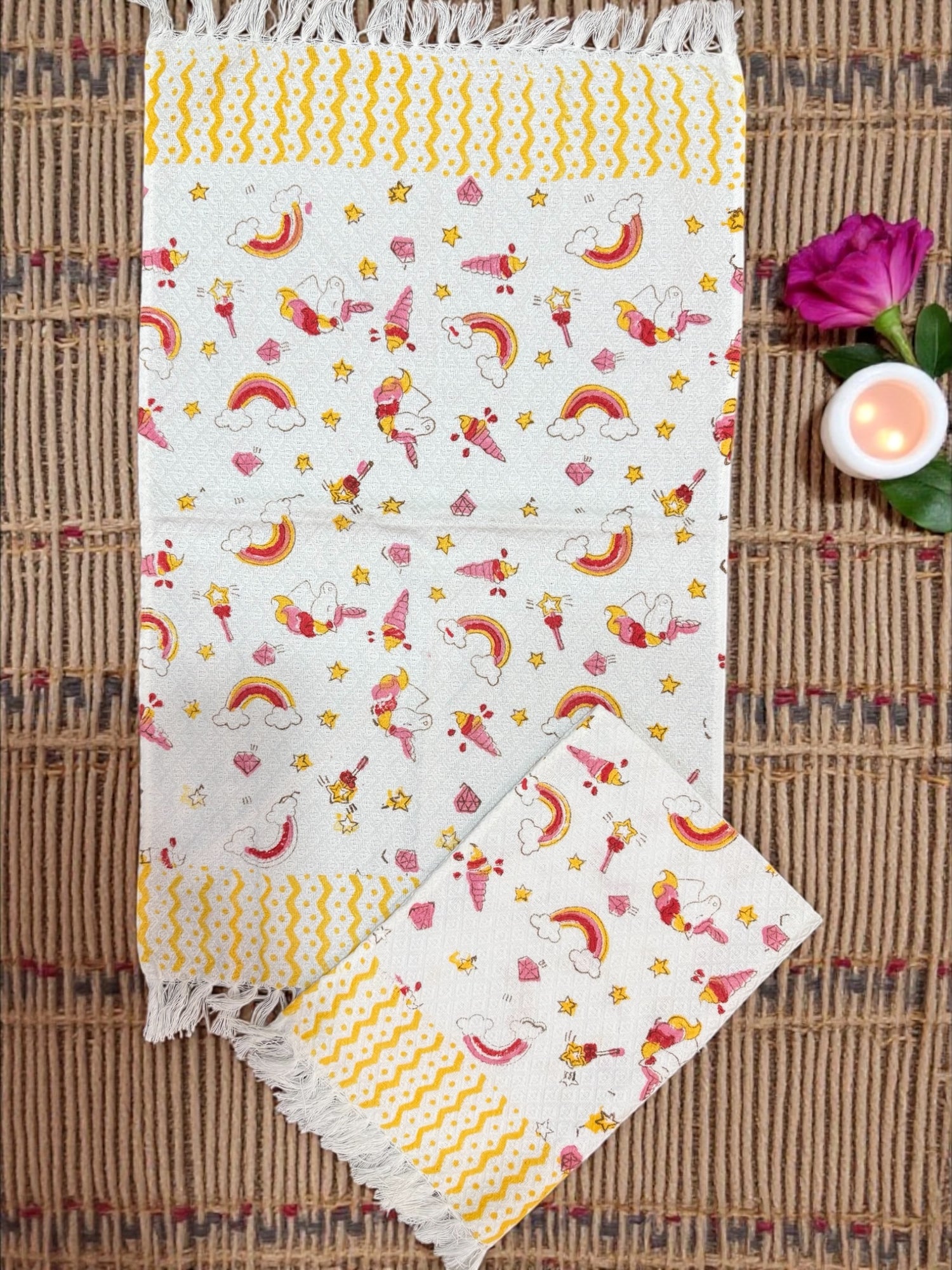 Designed for little routines, this kids bath and hand towel set is crafted in a soft jacquard weave for everyday comfort. The clean white base is filled with rainbow arcs, unicorns, stars, and tiny magical motifs in gentle pinks and sunny yellows.