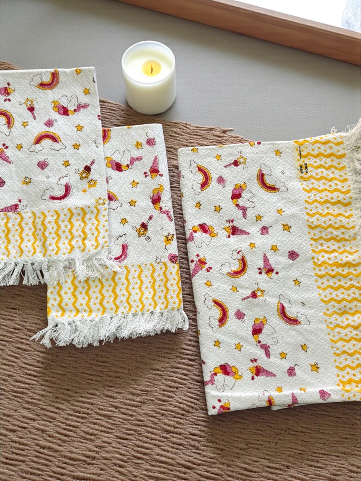 The textured weave feels light on the skin while remaining absorbent and quick-drying. Finished with bright yellow patterned borders and soft fringed edges, these towels feel playful yet practical. Perfect for daily use or gifting, they bring warmth, colour, and a touch of childhood wonder to bath time moments that feel gentle, safe, cozy, and happy every day.