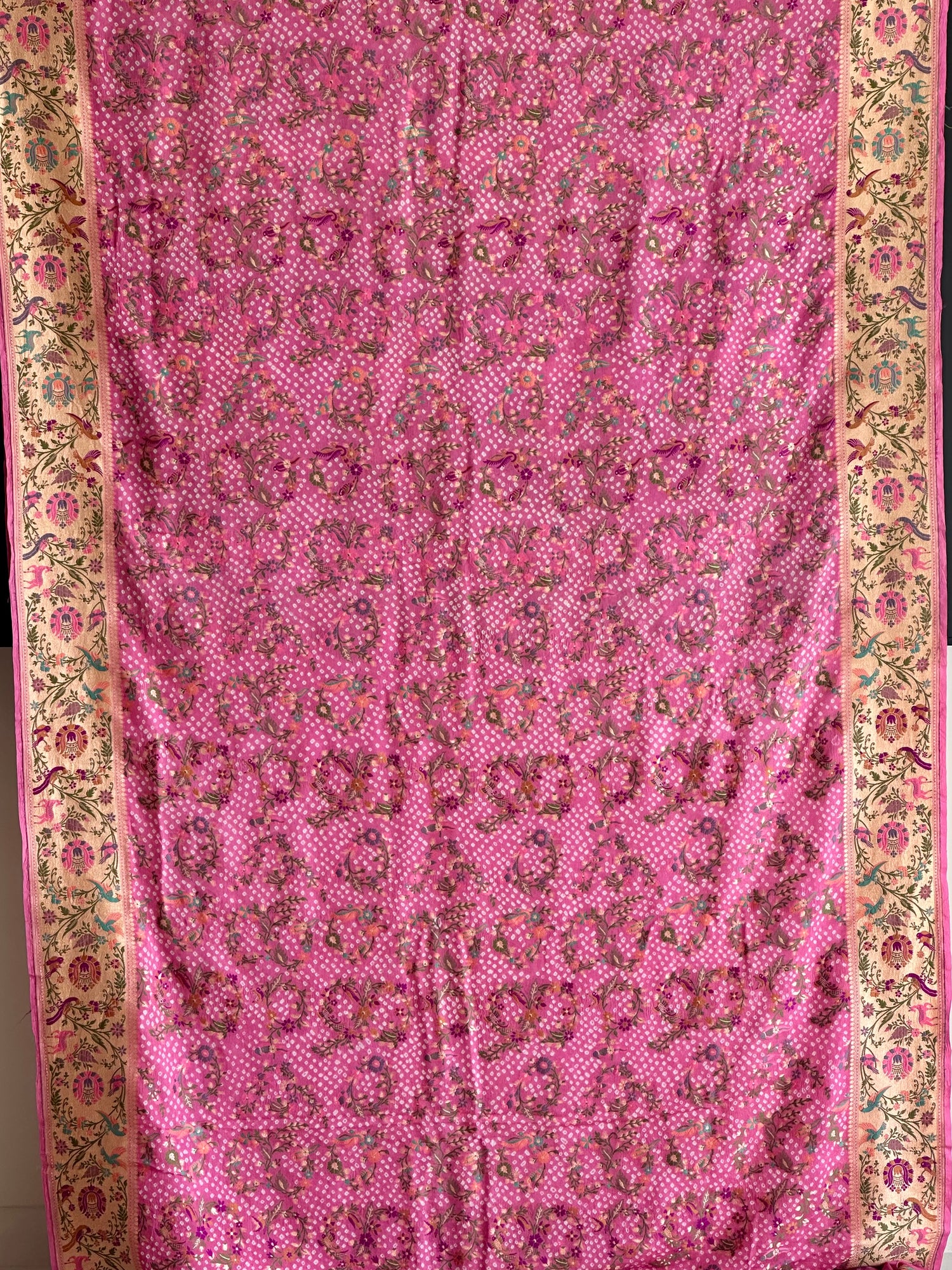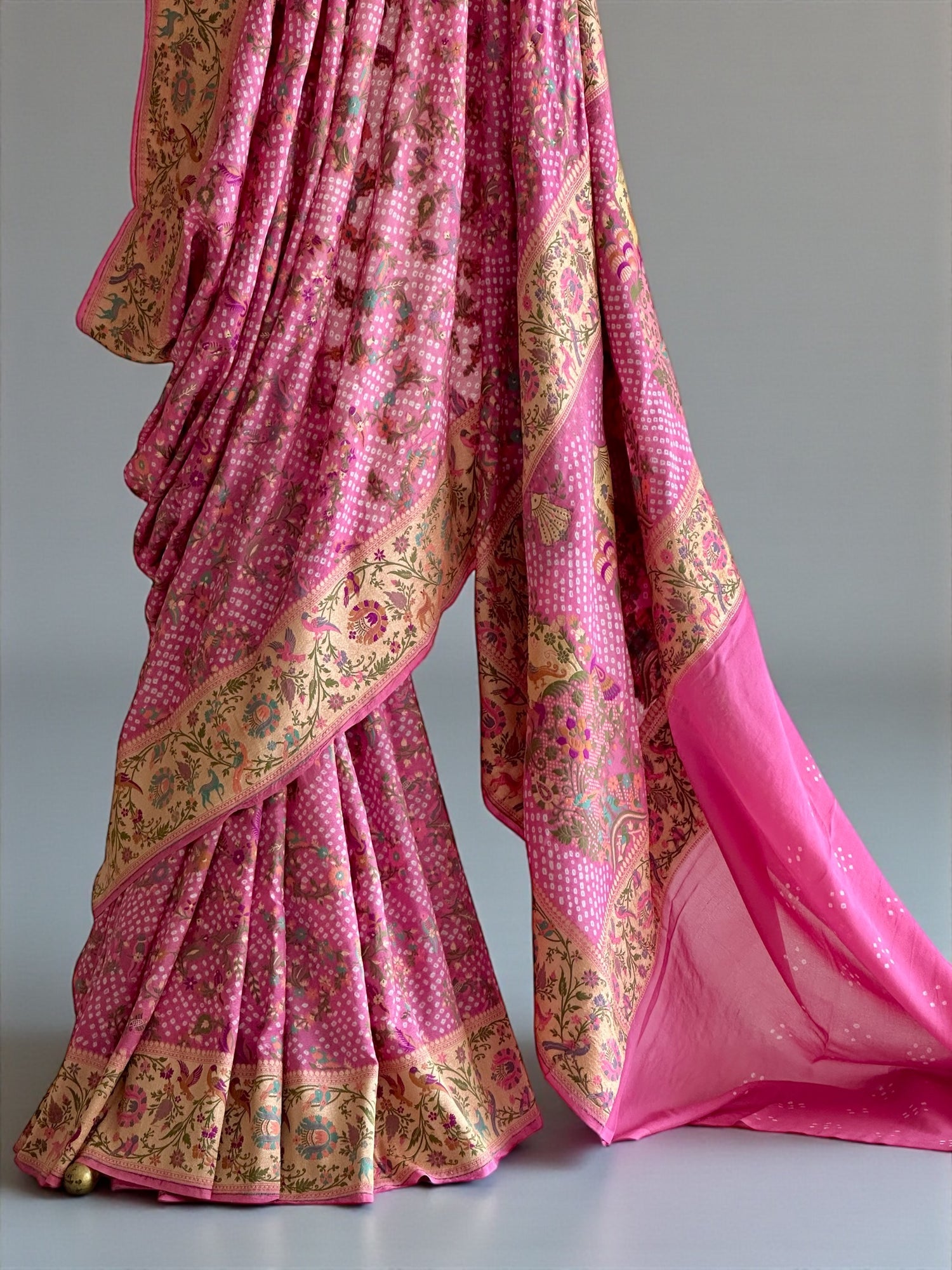 Hundreds of tiny knots, each one tied by hand before the dye is ever mixed. That is where this saree begins, in the quiet discipline of Bandhani, a craft that measures time not in hours but in the patience of fingers that know exactly when to hold and when to let go.