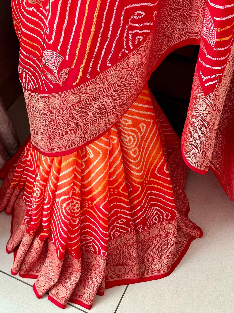 Red and Orange Exclusive Handloom Pure Banarsi Georgette Rai Bandhani Saree
