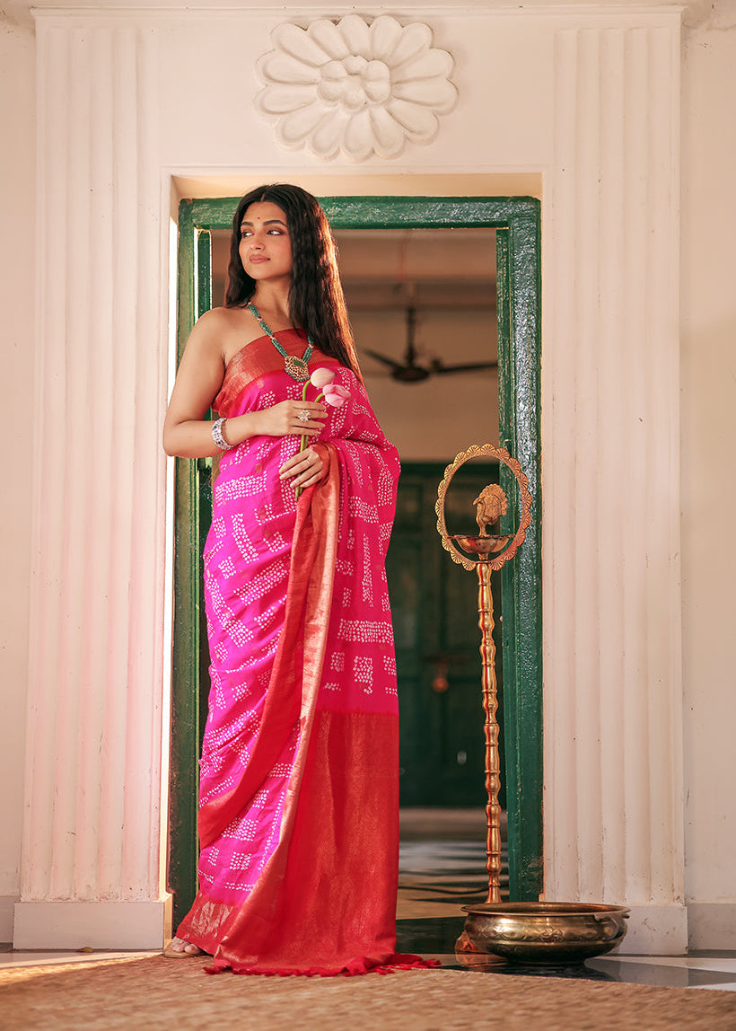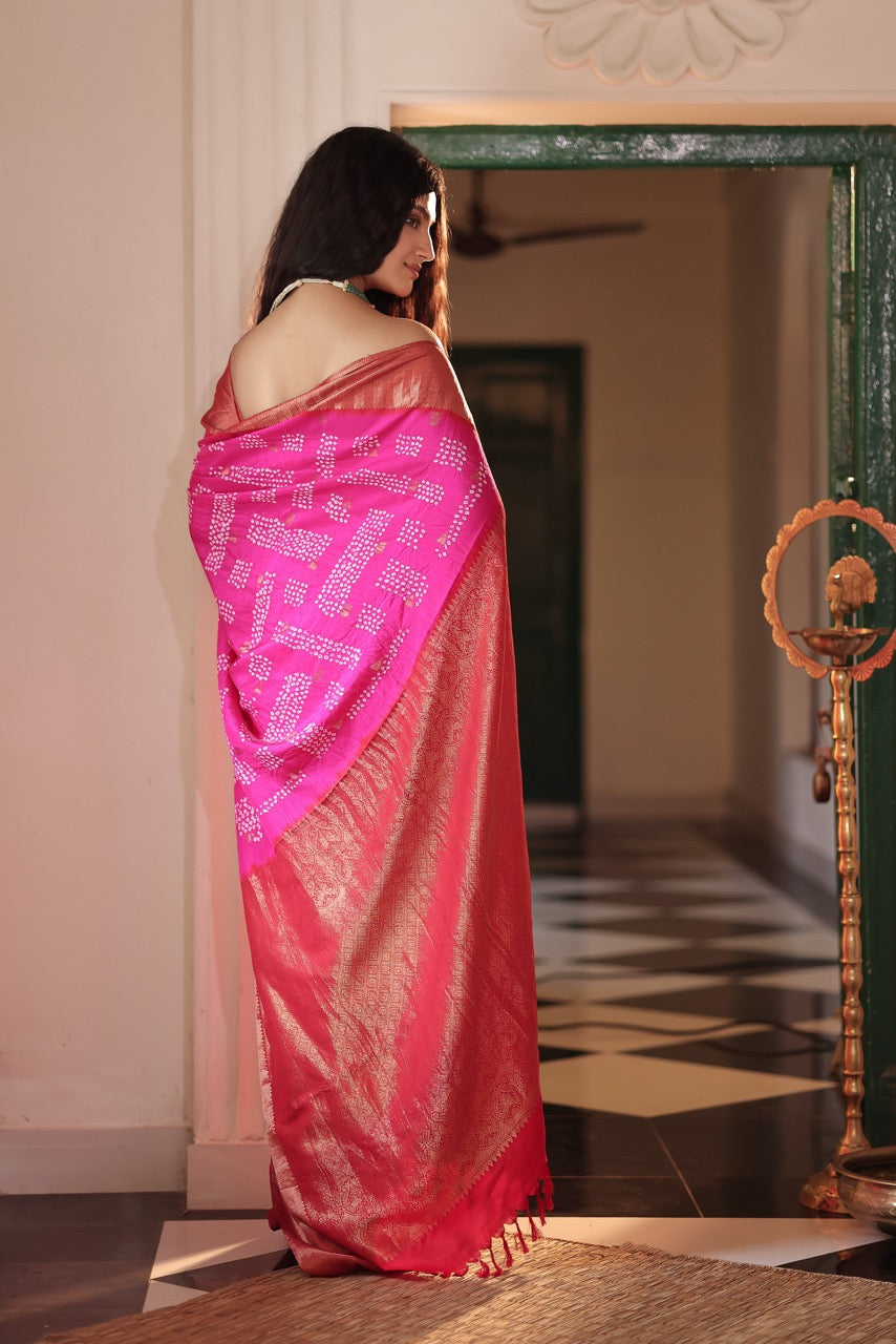 The saree’s body is striking pink, adorned with a distinctive Bandhani grid pattern—dots meticulously tied and dyed to create a maze-like geometric design. This Bandhani section carries the grace of Gujarat's age-old craft, echoing stories in every dot and line.