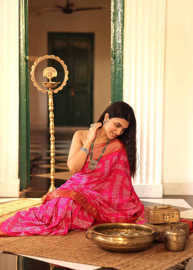 A poetic convergence of North and South, this saree marries the fluid artistry of Bandhani with the grandeur of Kanjeevaram in a truly regal ensemble. It is perfect for weddings, festivals, or when you simply want to embody grace in color.
