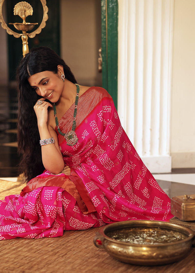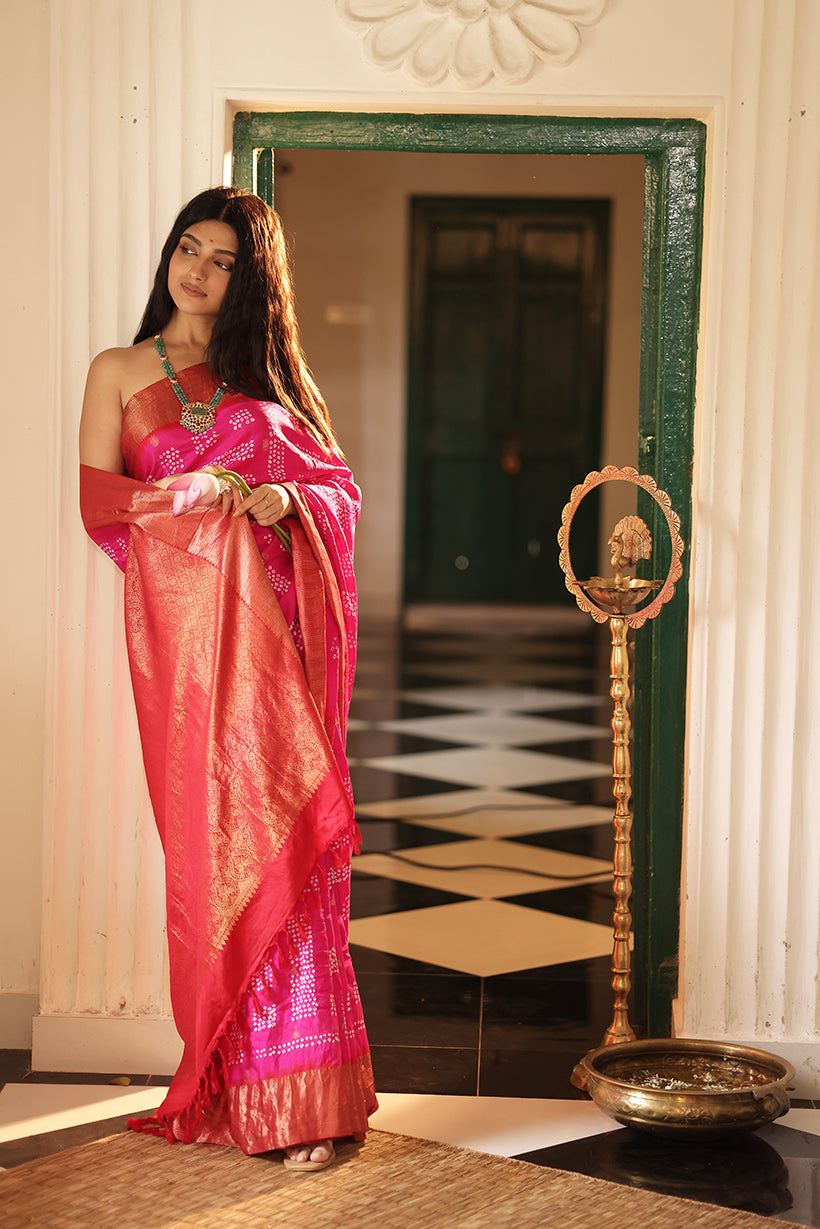The contrast of red Kanjeevaram pallu and border shimmer with zari weaving, adding grandeur to the Bandhani. The zari border has a subtle golden sheen with traditional motifs, balancing the boldness of the pink with the depth of red.