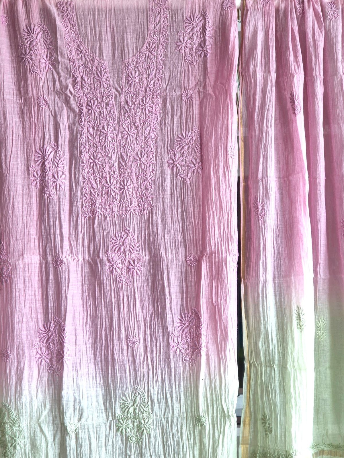 Unstitched Mul Chanderi Chikankari suit set adorned with intricate hand embroidery that exudes timeless charm and understated sophistication. Images are left crushed for style, to be ironed to achieve full width and length
