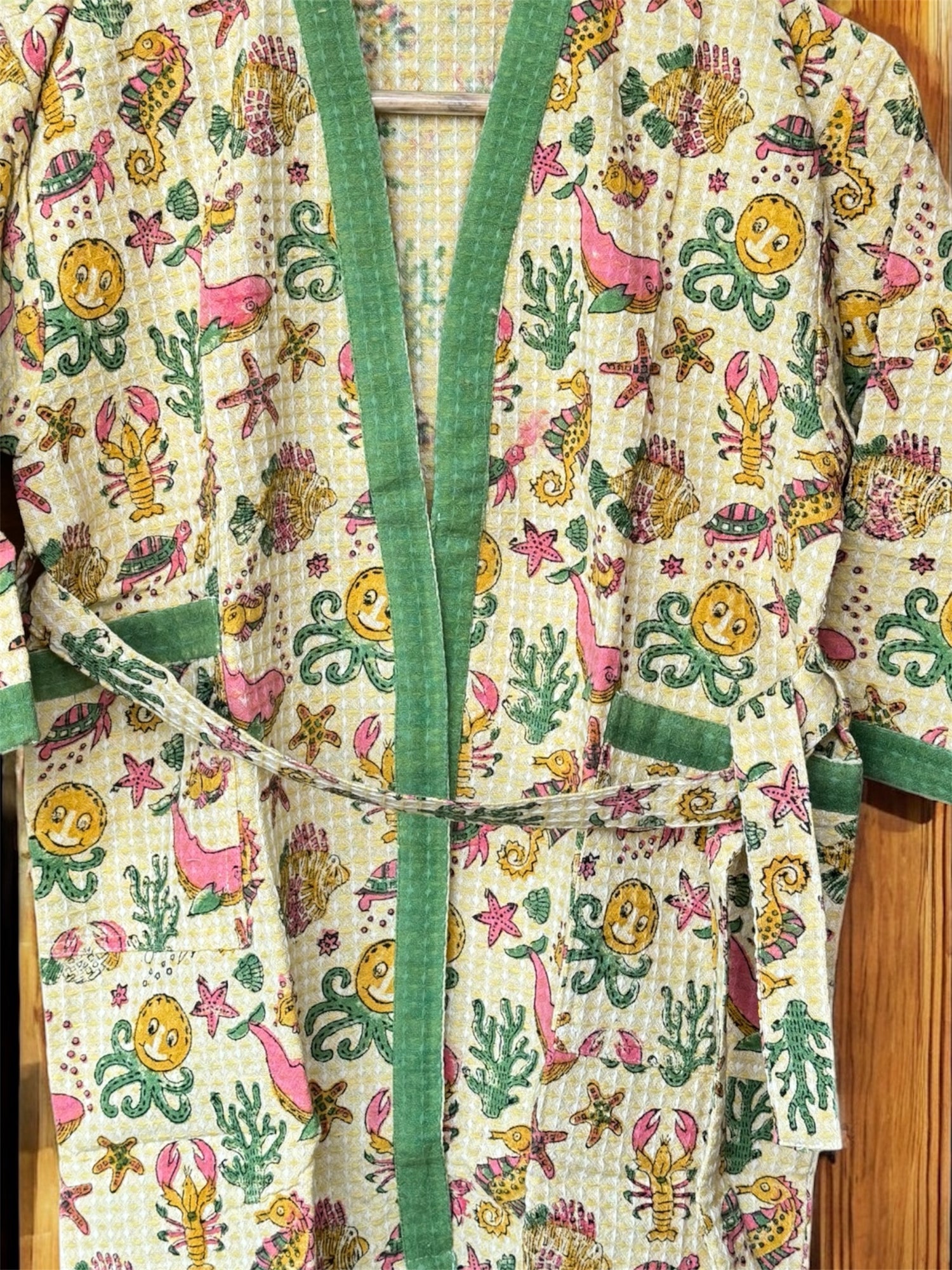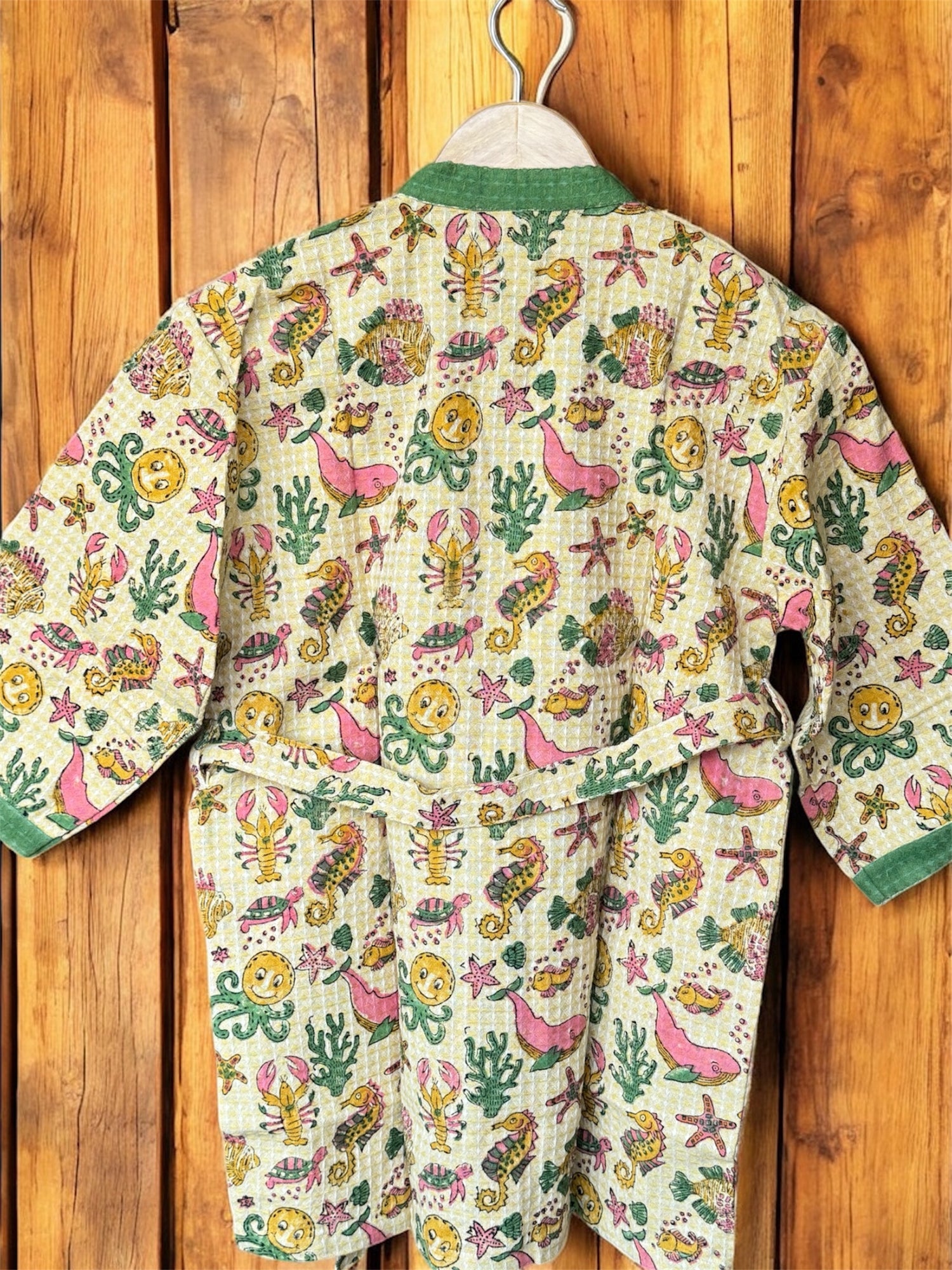 Bring the joy of the ocean to your little one’s wardrobe with our Kids Cotton Waffle Bathrobe – handblock printed by skilled artisans of Jaipur. Featuring a vibrant yellow base and adorable sea animals like octopus, lobster, crab, turtle etc. making it ideal for swimming classes, summer camps, beach vacations, or simply relaxing at home after a shower.